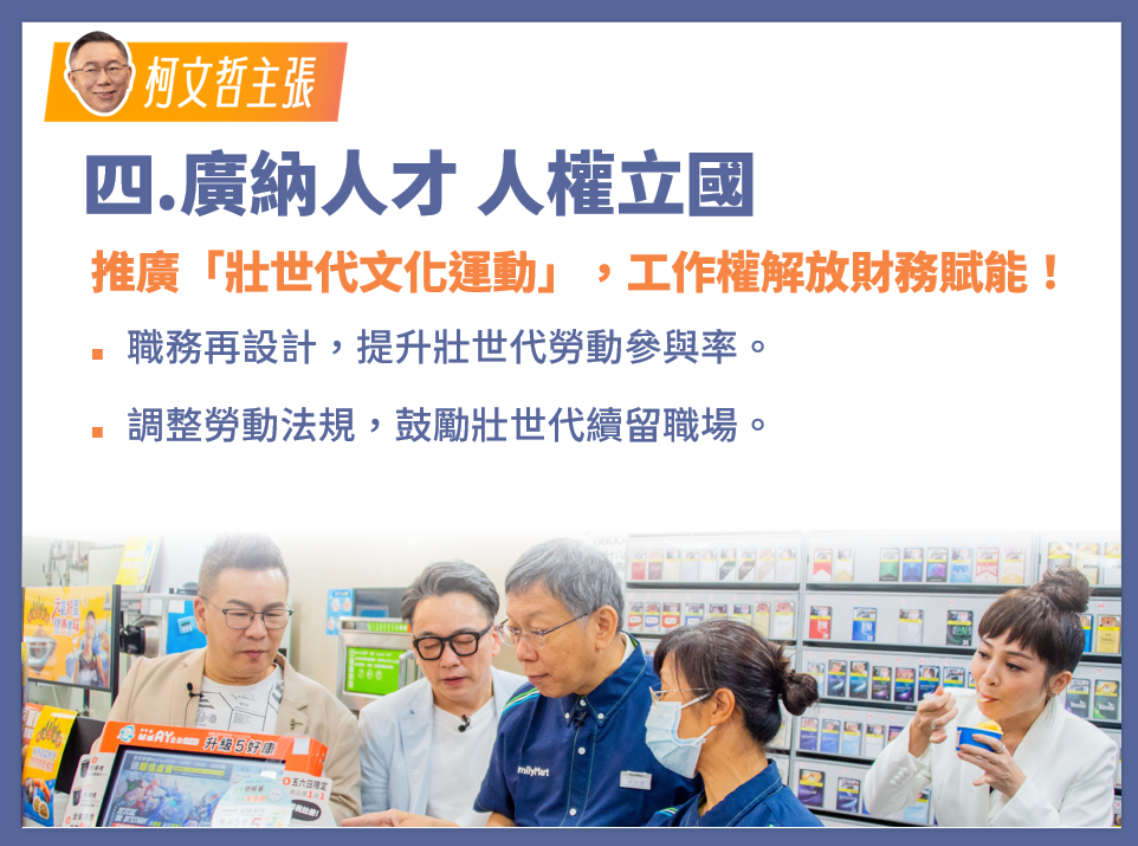 「狀世代文化運動」是柯文哲一再推廣的政策之一,柯文哲表示,日本的餐廳如麥當勞等服務員時常看到由長者擔任,台灣卻相反,因此他認為,除了推廣壯世代從新回到職場外,職務需要再設計,「哪一部分給長者做、哪一部分給年輕人做」,另外,為了讓壯世代續留職場,也需要適時調整勞動法規。