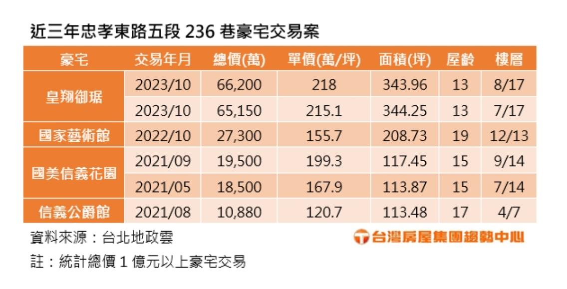 觀察近三年此名人巷的億級豪宅交易,包括「國家藝術館」、「國美信義花園」、「信義公爵館」等都有交易,成交單價落在120.7~199.3萬元,而今年成交的這兩戶「皇翔御琚」,則是穩居兩百萬俱樂部的豪宅。