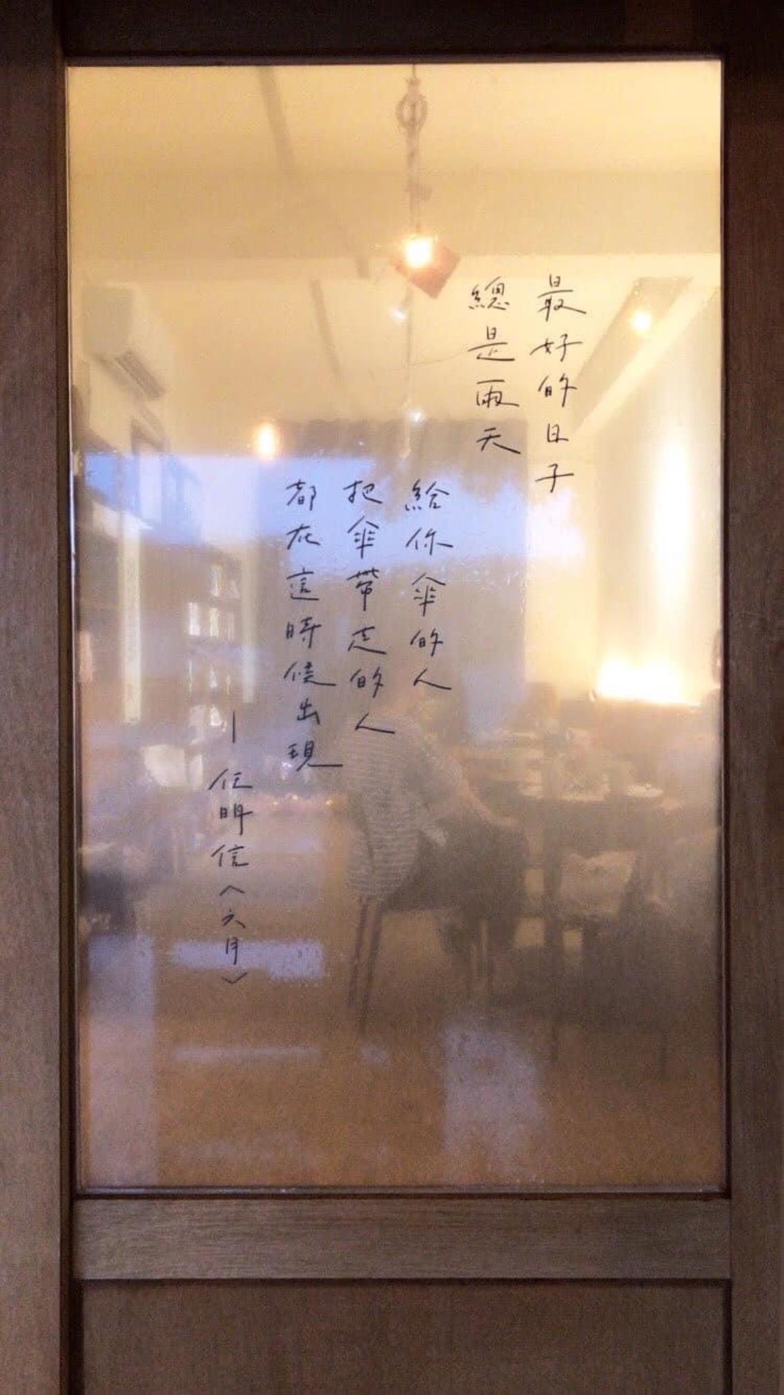 在書店的空間配置上,就像說故事,也要有一點曲折、探索的感覺,既然空間不大,更要讓它很有流通性,所以我們請詩人任明信和吳緯婷授權,將他們的詩書寫在玻璃上。因為聽說雙溪一年可能就下了200天的雨,任明信的這首〈六月〉,我非常喜歡: