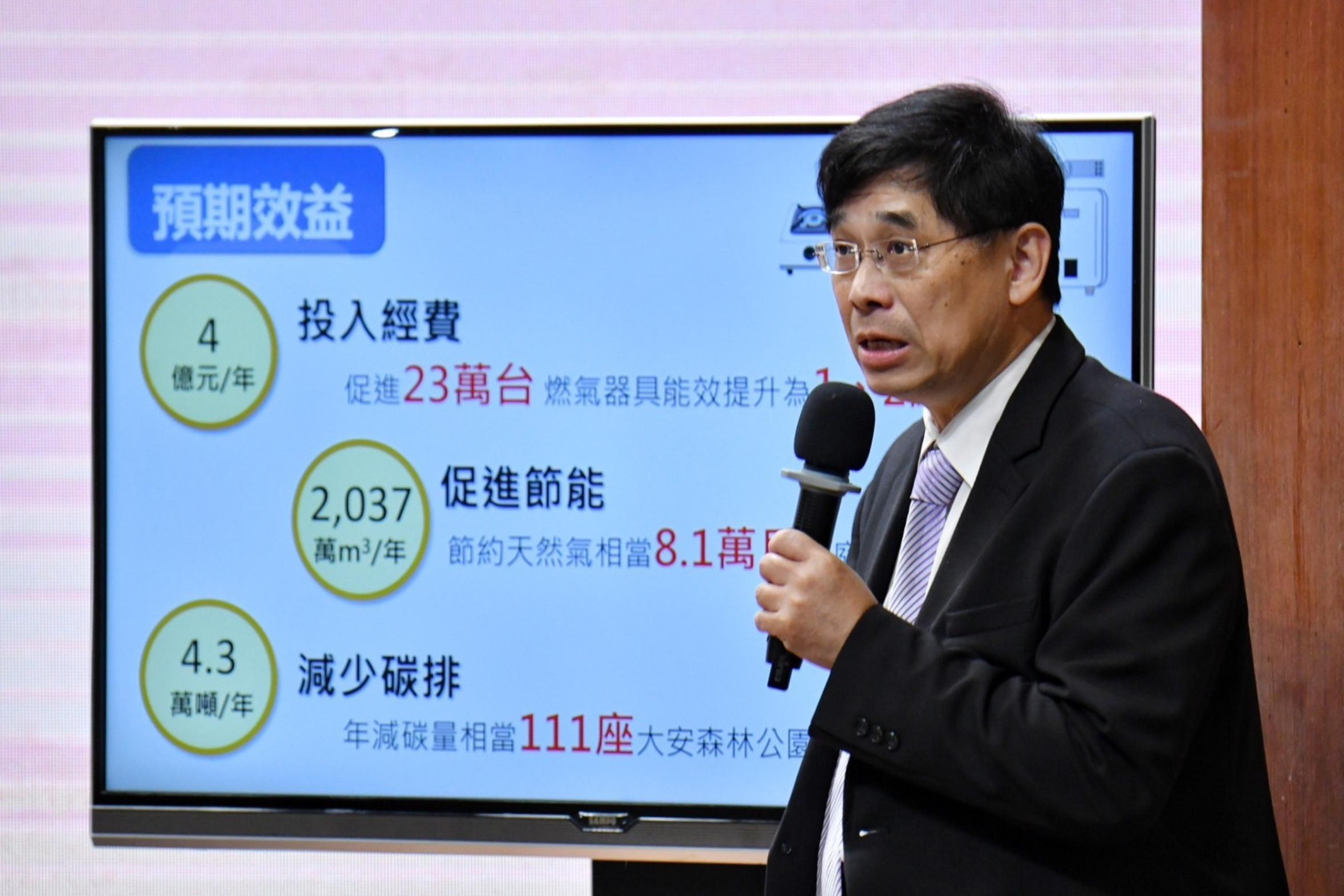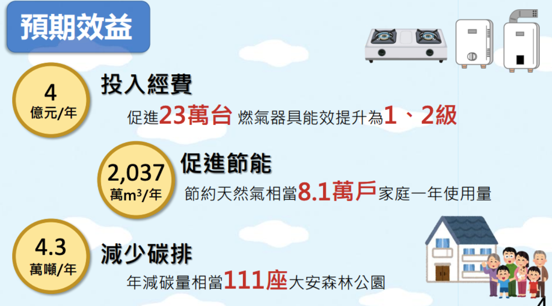 經濟部表示,本次補助預估每年可節省天然氣2,037萬立方公尺,相當於8.1萬戶一般家庭燃氣使用量,年減碳量約4.3萬噸。此外,新型瓦斯爐有防乾燒、防漏自動斷氣等安全功能;強制排氣瓦斯熱水器,可減低室內一氧化碳濃 度,亦有助提升民眾居家安全,預估年減碳量等同111座大安森林公園。