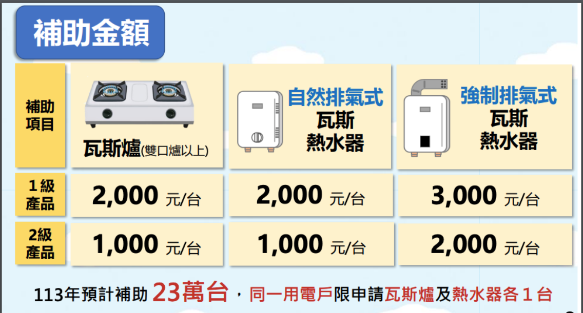 補助金額每台最高為3000元,每戶申請以瓦斯爐與熱水器各1為限,民眾可以採網路線上申請或紙本郵寄掛號申請。各補助產品項目及每台 補助金額如下: