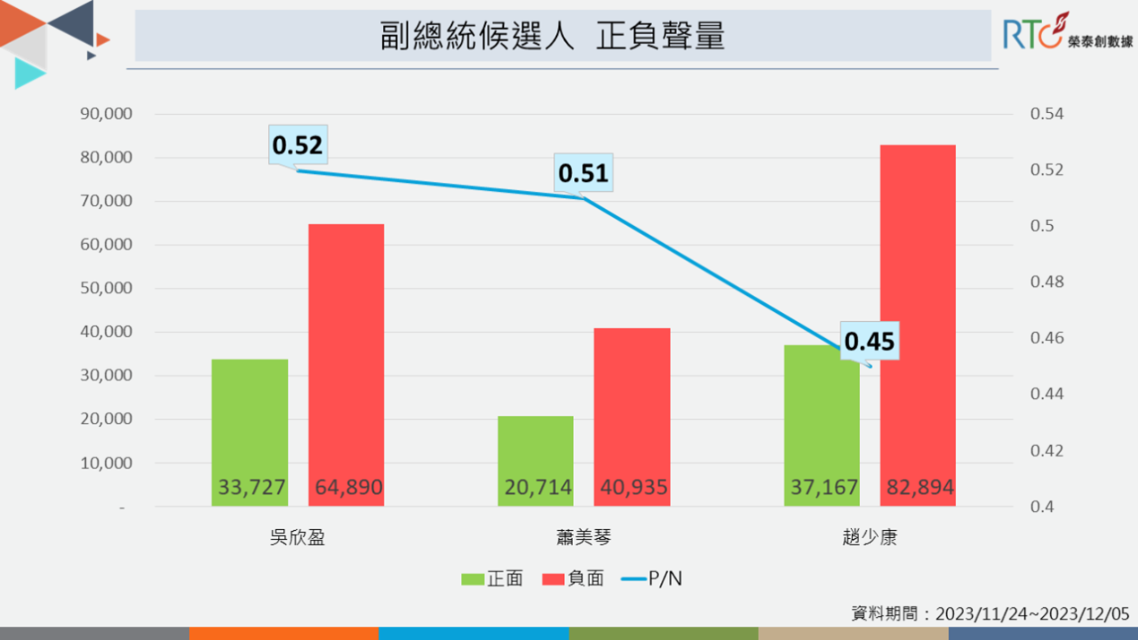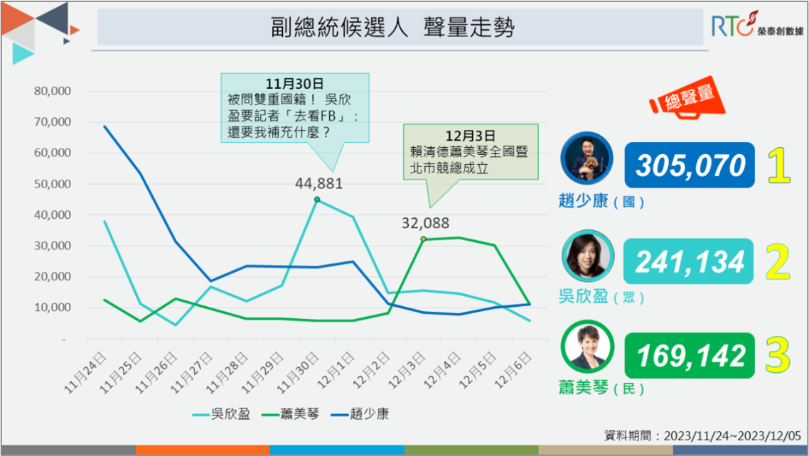 《榮泰創數據》分析11月24日至12月5日之間,三位副總統參選人的網路聲量表現,國民黨趙少康的聲量在三人中脫穎而出,近兩周累積30.5萬則聲量,除了因他擅長主動攻擊、發起話題外,近期他也計畫前往校園演講、參與網紅脫口秀及直播頻道,為炒熱網路話題及討論度,搶攻年輕族群。