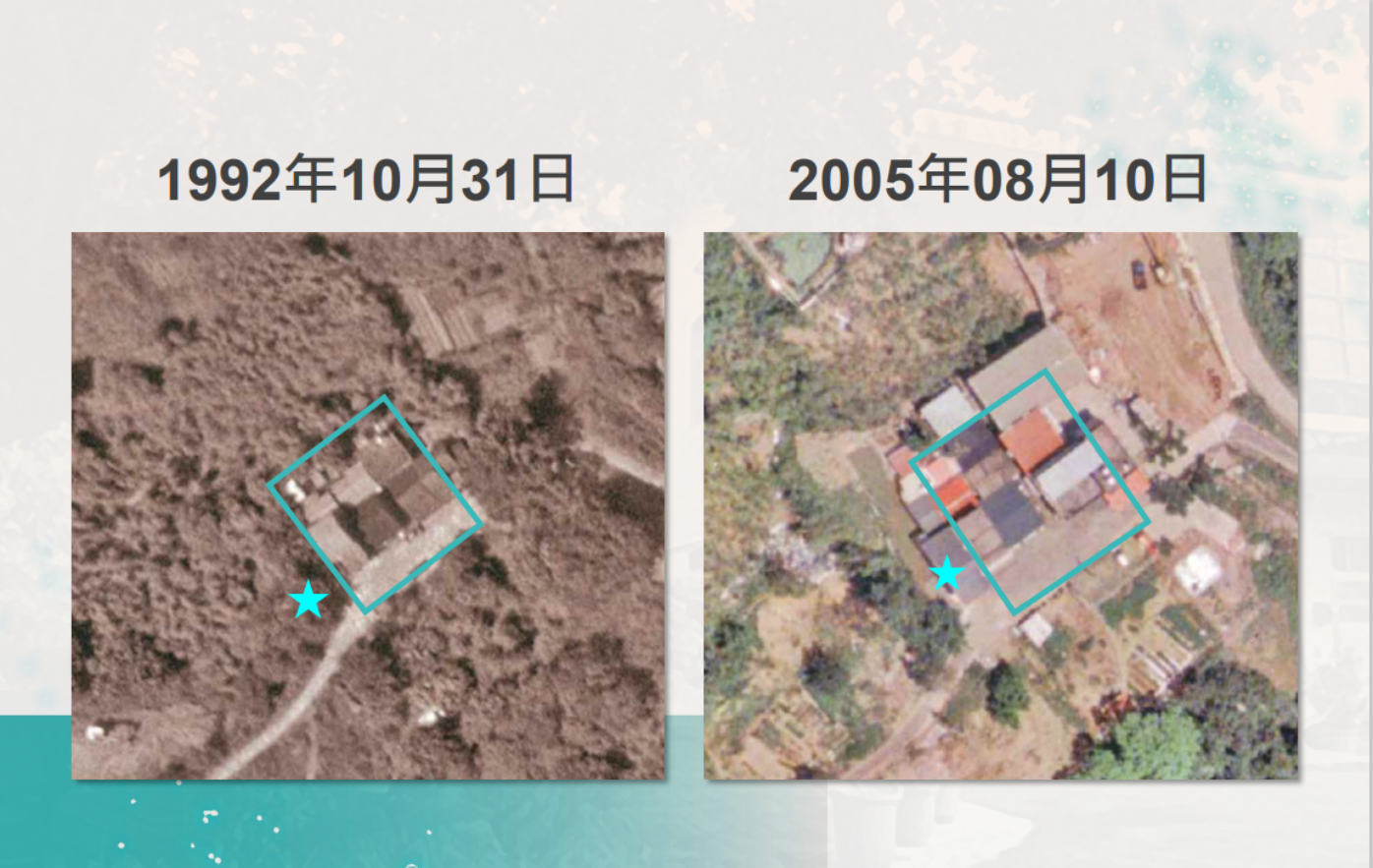先前賴清德曾澄清表示,北部區域計畫施行對建築管制日期是民國70年2月,該建物在民國60年左右就拿到門牌,因此沒有違建問題。在會中,黃國昌先拿出多張空照圖娓娓道來,由空拍圖可發現,1992至2002年期間皆尚未出現該2層建築,然而從2003年開始出現整地情形,並在2004年2月兩層建物完工,再到2005年8月系爭建物旁的花園興建完畢。
