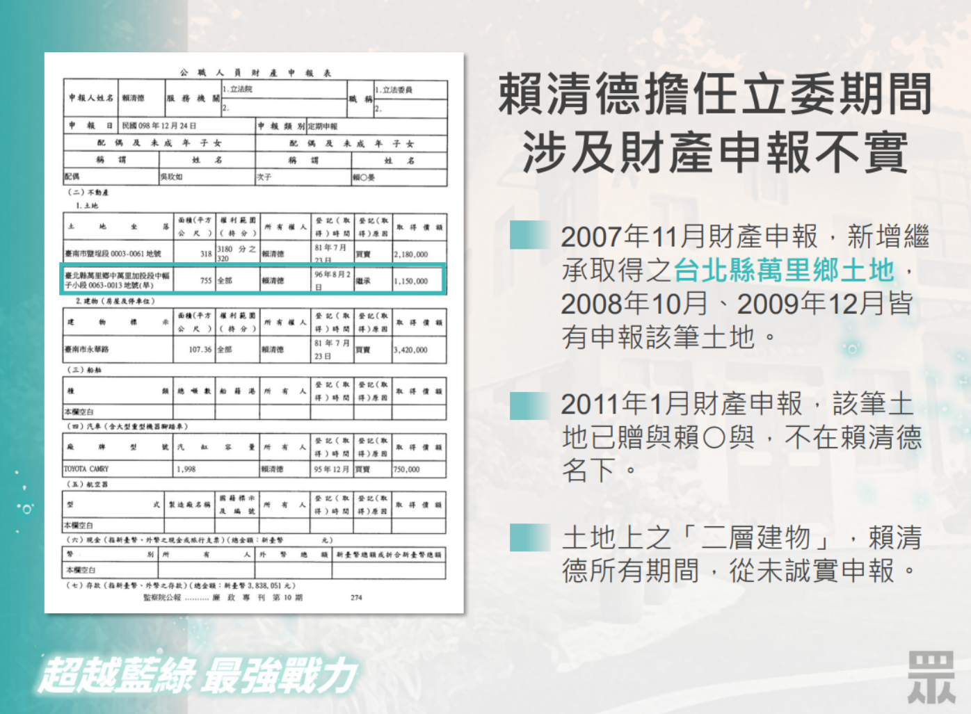 第三,該建築物由賴清德所有的期間,從未誠實申報公職人員財產申報表,違反《 公職人員財產申報法》。
