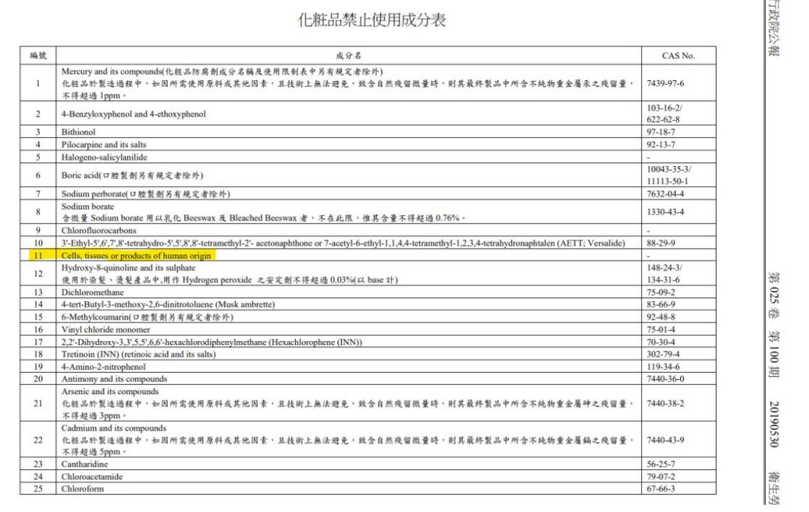 食藥署副署長陳惠芳接受《信傳媒》訪問時表示,「食藥署已參酌國際間化粧品管理規定,研議修訂化粧品禁止使用成分表之『人體來源之細胞、組織或產品(Cells, tissues or products of human origin)』範圍,後續將儘速完成法制作業發布相關規範。」