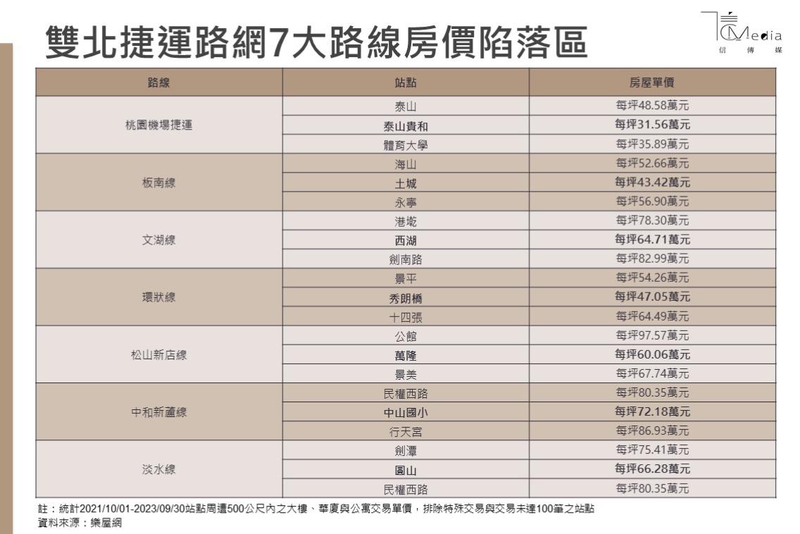 樂屋網分析北部捷運路網7大路線近2年房屋單價,結果發現,房價陷落最大的站點是桃園機場捷運的「泰山貴和站」。樂屋網調研中心經理洪安怡指出,泰山貴和站兩旁站點漲幅飛快,讓該站成了房價陷落區,如前一站「泰山站」位處新北面積最大的塭仔圳重劃區,新建案每坪單價坐5望6。後一站「體育大學站」位於A7重劃區,是雙北高房價擠壓效應下,首購族的購屋選項,近年推案量暴增,價格也水漲船高。