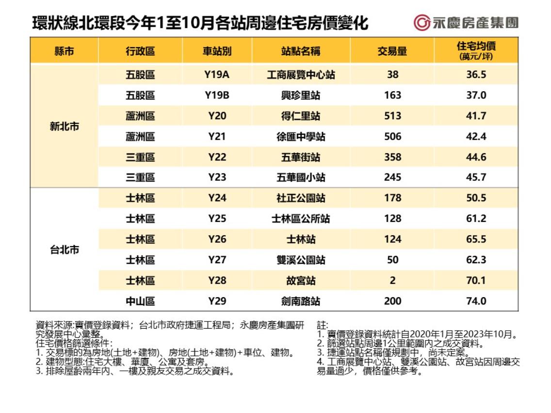 隨著環狀線北環段各區段陸續開始決標、動工,環狀線網路逐漸「成環」,雙北之間的交通流動也有望獲得顯著提升。永慶房產集團統計今年1至10月實價登錄中,北環段站點周邊房市價量表現。其中,得仁里站以513件交易量居冠,劍南路站則以74.0萬均價成為最貴站點。
