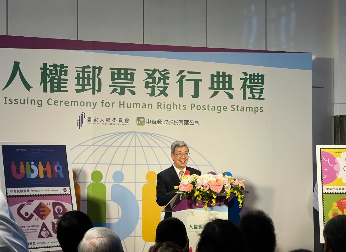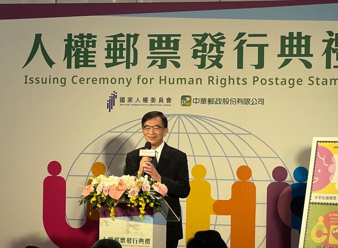 中華郵政8日發行人權郵票,行政院長陳建仁在發行典禮時表示,台灣在去年已推動國家人權行動計畫,涵蓋人權教育、平等與不歧視等議題,對九大人權公約中,有5部已制定國內法,讓國際看見台灣在人權方面的進步,希望透過不斷努力讓台灣人權持續向前邁步,成為更溫暖的國家。陳建仁進一步表示,他本身是集郵者,小時候就曾從郵票的方寸之美中,學習到許多知識,今日發行人權郵票更傳達深遠人權觀念。