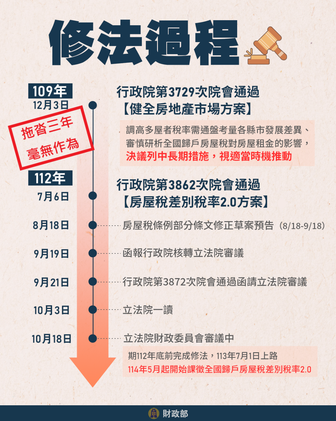 但問題是,財政部卻一再以「技術困難」、「地方有意見」等理由,拖沓超過三年未有積極作為。直到大選將屆,財政部才終於在今年7月端出改革方案,並於10月初將《房屋稅條例》修法草案送入國會,並對外表示如於今年底修法通過,2024年即可上路實施。
