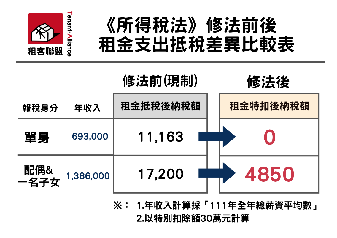 另一重點是租金支出抵扣制度改革,目前《所得稅法》第17條針對租金支出扣除規定為「列舉扣除12萬元」,乃財政部依1999年的租金行情訂定,但時過境遷,抵扣額度與目前租金行情相去甚遠,採「列舉扣除」更讓此機制形同雞肋。