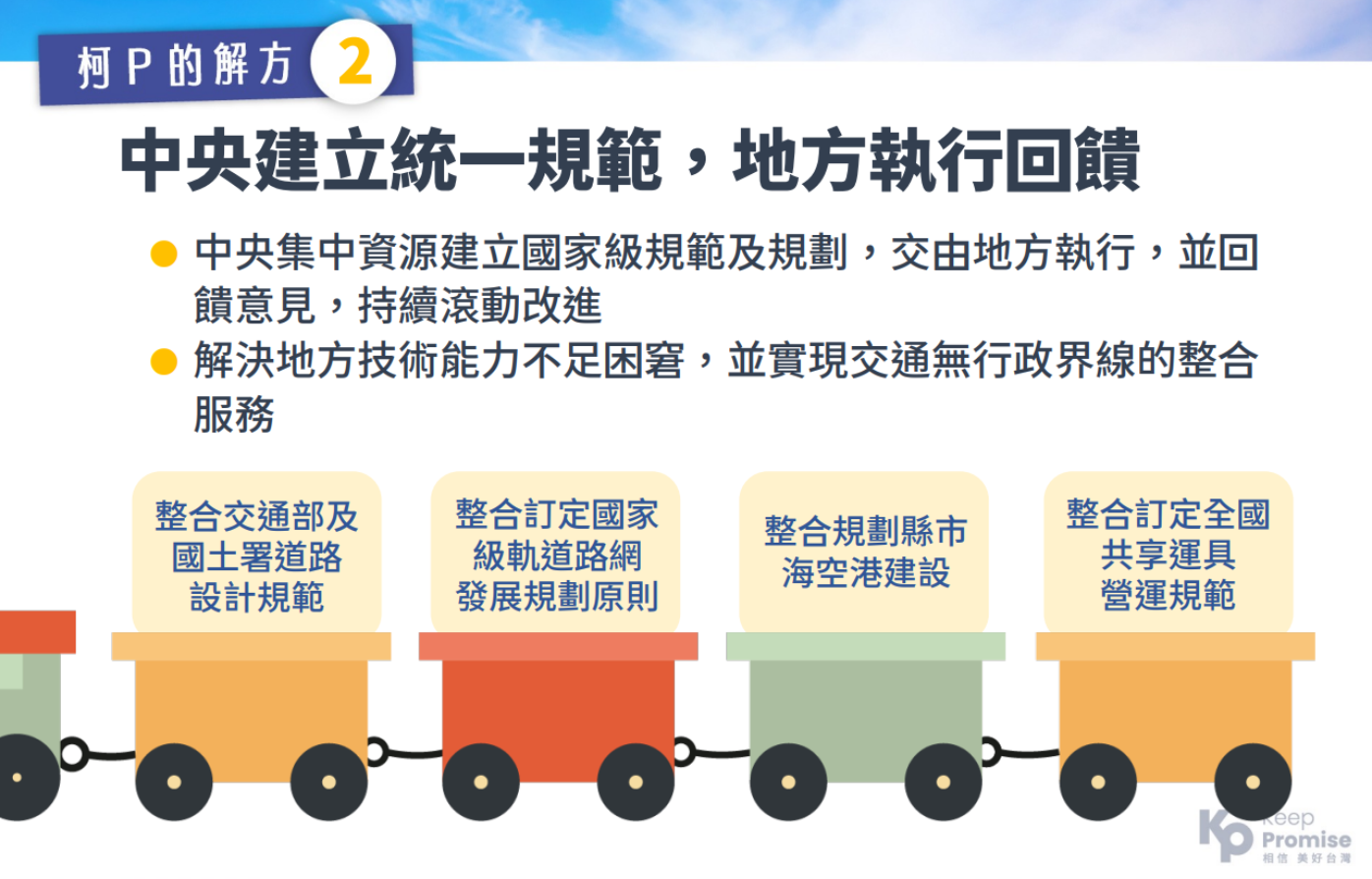 柯文哲也提出建立「全國一站通行的交通App」,不宜給各縣市自己處理,和以中央資料庫數據共享給全國,推展「跨單位、跨系統」的聯合城市管理大腦等眾多政策。