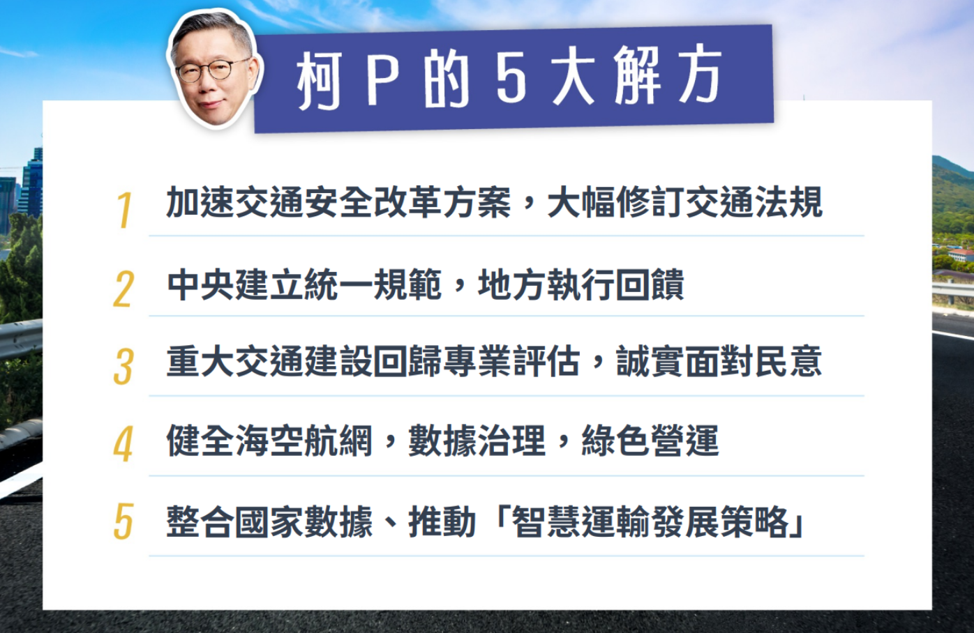 「我知道其他兩黨現在都忙著造勢,不過我們還是要負責任地把台灣的問題點出來」柯文哲走上台講了這句話,並開始點出台灣交通5大問題,包含車輛至上、忽視行人;交通制度和品質混亂,缺乏國家級規劃;國際海空港升級太慢;碎化式資訊發展難成大局,以及漠視專業,重大交通建設淪為選舉空頭支票。