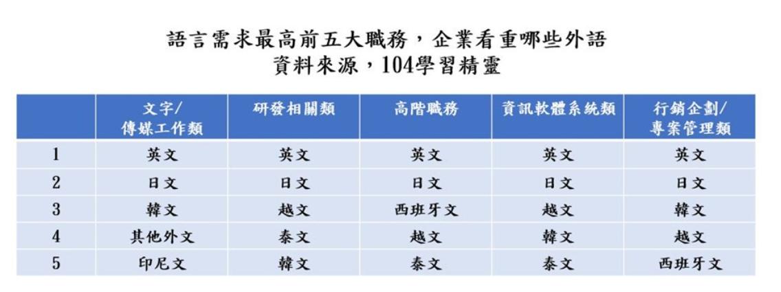 最需要語言的前五大職務為:文字/傳媒工作類、研發、高階主管、資訊軟體系統類、行銷企劃/專案管理類。文字/傳媒工作類,除了英文、日文之外,另以韓文較為突顯;軟體及研發職務,除了英文、日文要求外,另以越文較為突顯。
