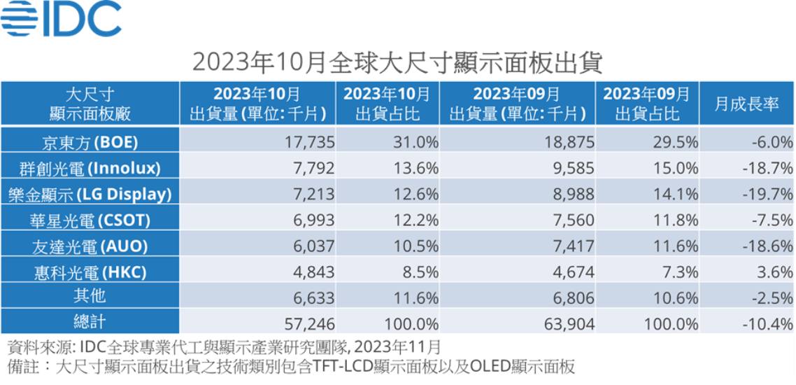 根據IDC(國際數據資訊)最新全球專業代工與顯示產業研究團隊最新的全球大尺寸顯示面板出貨追蹤報告(Worldwide Large Panel Monthly Shipment Volume Tracker)顯示,2023年10月各類大尺寸顯示面板月出貨量均明顯衰退,電視顯示面板(TV Panel)月減-7.0%、顯示器顯示面板(Monitor Panel)月減-10.9%、筆記本電腦顯示面板(Notebook Panel)月減-15.9%以及平板電腦顯示面板(Tablet Panel)月出貨月減-7.6%。