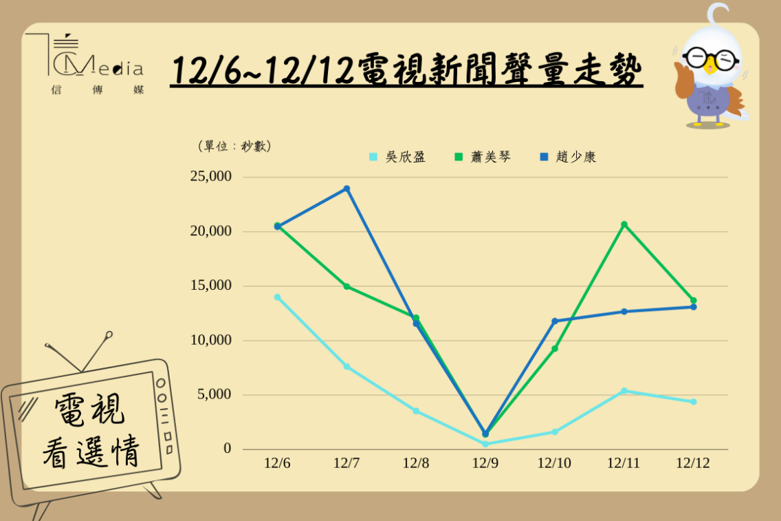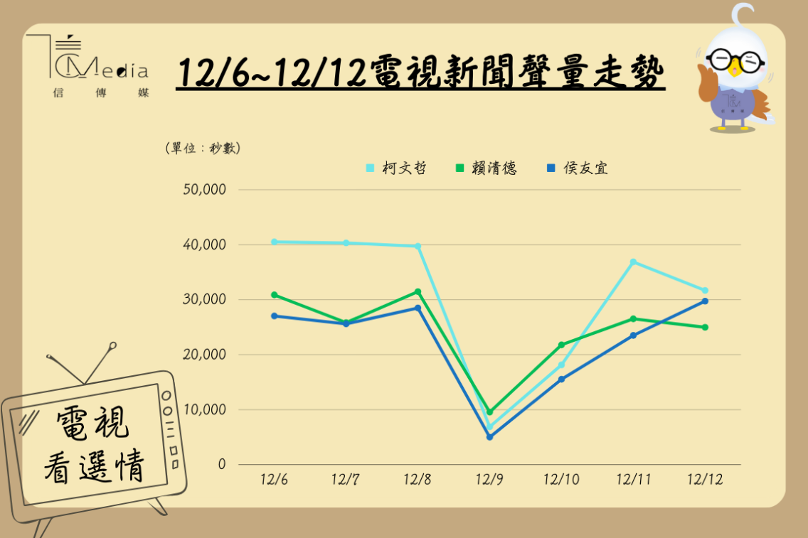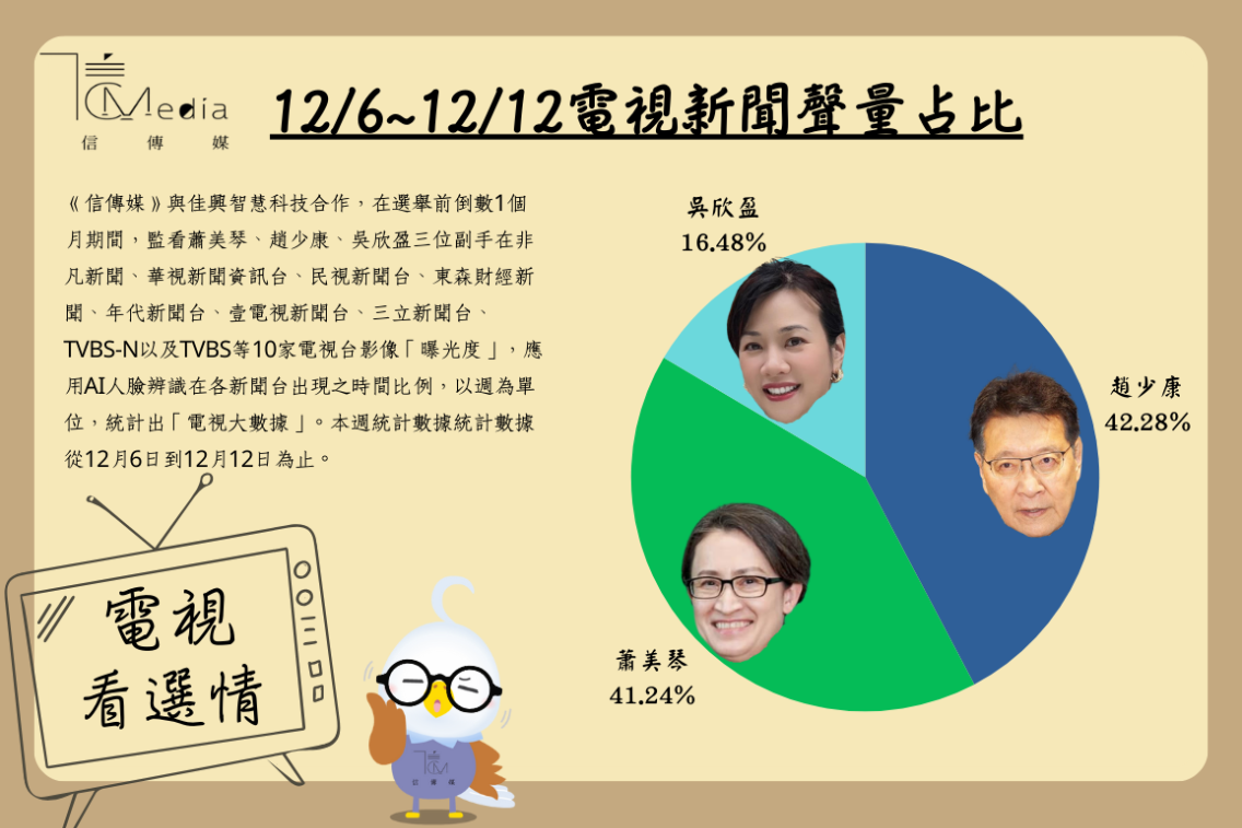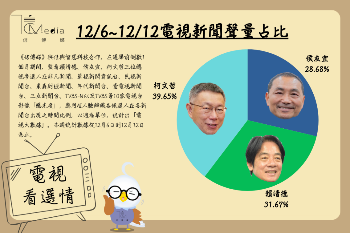 《信傳媒》與佳興智慧科技合作,在選舉前倒數1個月期間,監看賴清德、侯友宜、柯文哲三位總統參選人,以及蕭美琴、趙少康、吳欣盈三位副手在非凡新聞、華視新聞資訊台、民視新聞台、東森財經新聞、年代新聞台、壹電視新聞台、三立新聞台、TVBS-N以及TVBS等10家電視台影像「曝光度」,以候選人曝光的秒數為基礎,應用AI人臉辨識各候選人在各新聞台出現之時間比例,以週為單位,統計出「電視大數據」。本週統計數據從12月6日到12月12日為止。