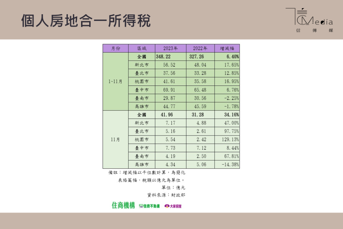 依據財政部資料,今年前11個月全國個人房地合一稅收共348.22億元,比去年同期增加6.4%,新北市今年前11月稅收年增幅17.6%,其增幅六都最高,且新北市11月稅收共7.17億元,是今年以來單月新高,年底不動產交易挽回上半年頹勢,不過南二都仍顯低迷,前11月跟去年同期相比稅收減少。