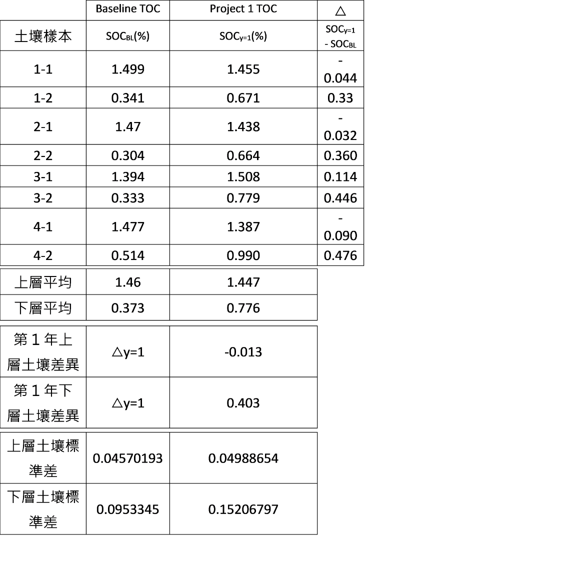 tCO2e=土壤增加總有機碳(TOC)% X 面積(平方公尺) X 土壤深度(公尺) X 土壤密度 X 44/12(二氧化碳分子量44與碳原子量12的比值)