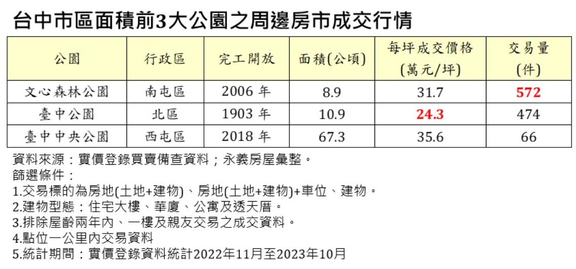 住家附近就有公園綠地是許多都市人的夢想,永義房屋盤點台中市面積前三大的公園,發現3大公園半徑一公里內,還有2字頭房價!永慶房產集團研展中心副理陳金萍指出,「文心森林公園」周邊房屋類型多樣,年交易量達572件,買氣最旺;「臺中公園」發展最早,每坪均價僅24.3萬元,房價最親民;而有台中之肺美譽的「臺中中央公園」,緊鄰十四期重劃區,未來發展值得期待。
