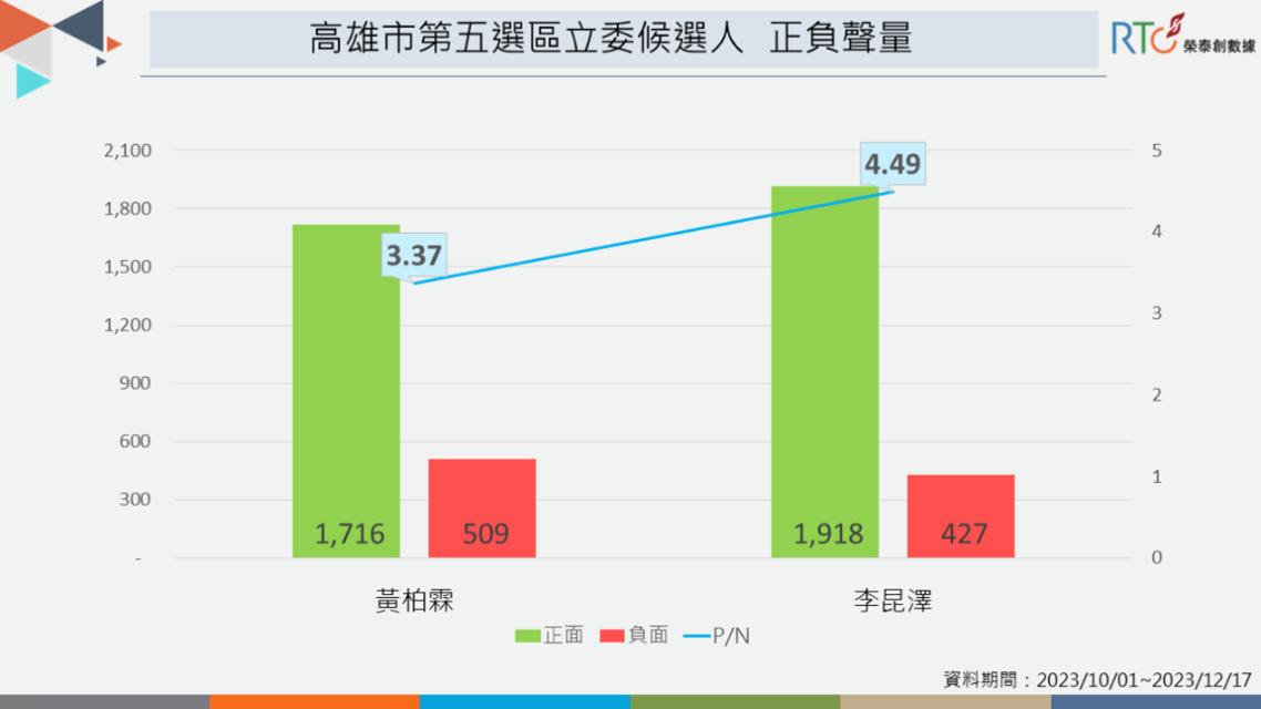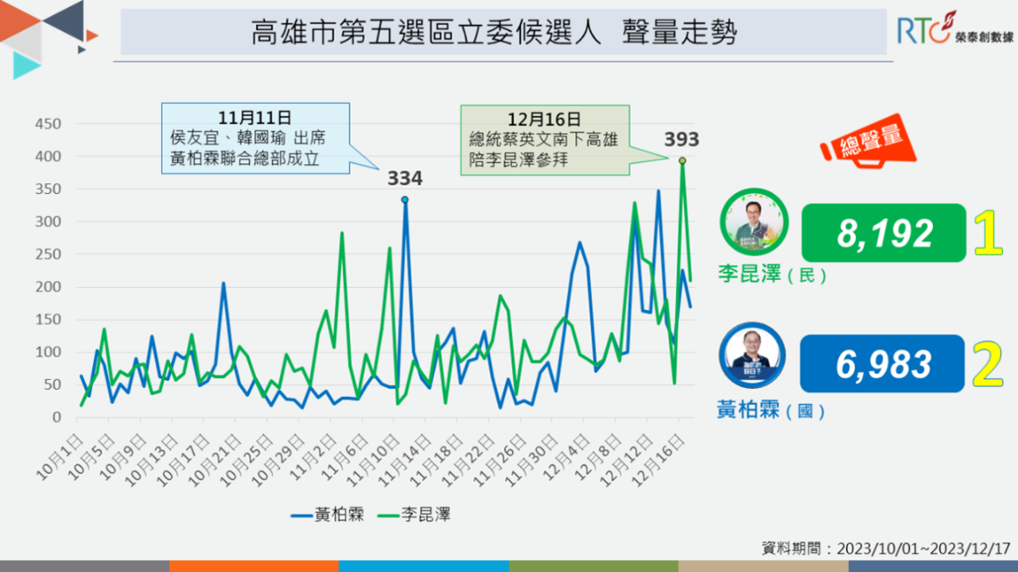 《榮泰創數據》分析李昆澤與黃柏霖過去兩個半月的網路聲量表現,雙方都著重於社群經營,每日聲量多來自個人粉專的一般宣傳、掃街行程或宣傳政見等,在社群上的發文頻率較為積極,累積不少基礎聲量。