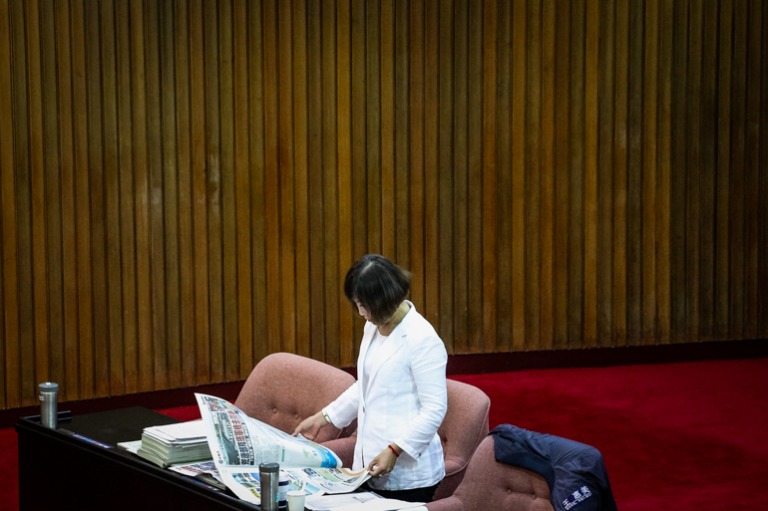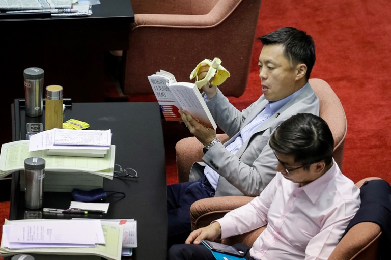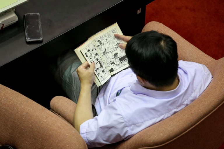 因議事冗長,部分委員翻閱起漫畫報章書籍,以消磨時間。(攝影/蕭芃凱)