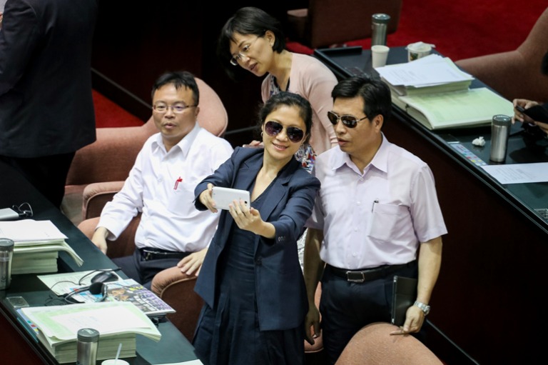 由於議事冗長,有委員戴著墨鏡玩自拍解悶。(攝影/蕭芃凱)