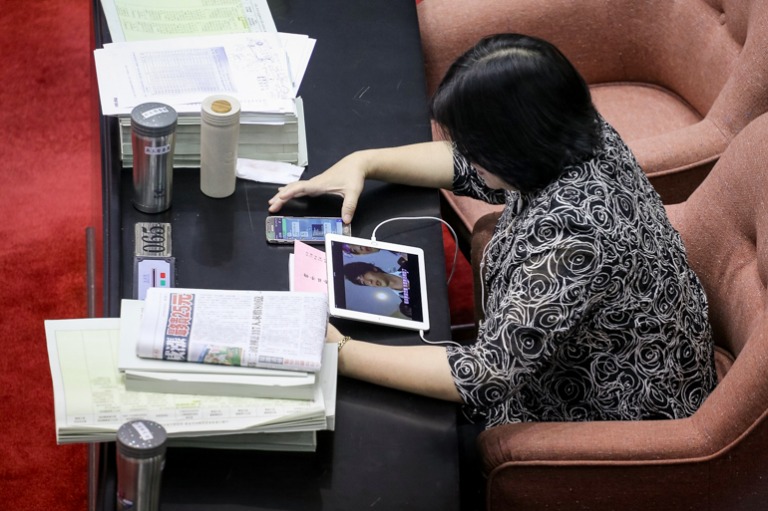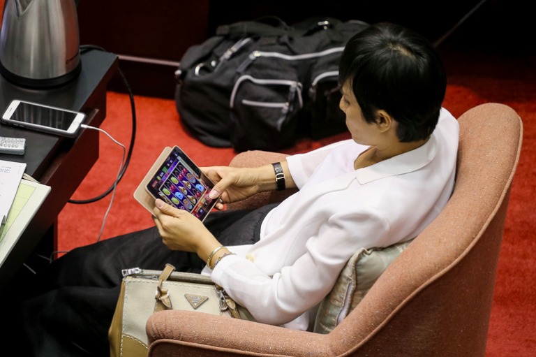 由於國民黨立委發動發言拖延時間,有委員玩起平板遊戲消磨時間。(攝影/蕭芃凱)