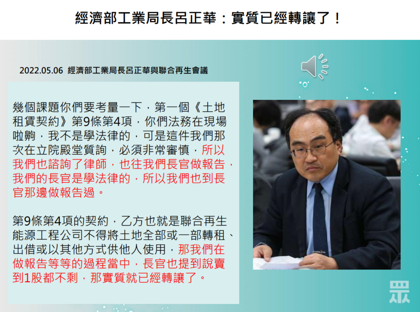 不僅如此,黃國昌於記者會播放錄音檔,經濟部前工業局長呂正華2022年5月在與聯合再生的會議上表達強烈不滿,並直言「不是我加重語氣,是我們的長官也加重語氣」、「賣到一股不剩,實質就已經轉讓了」,那麼經濟部為何沒有根據契約書上表明,依法終止租約、收回土地?