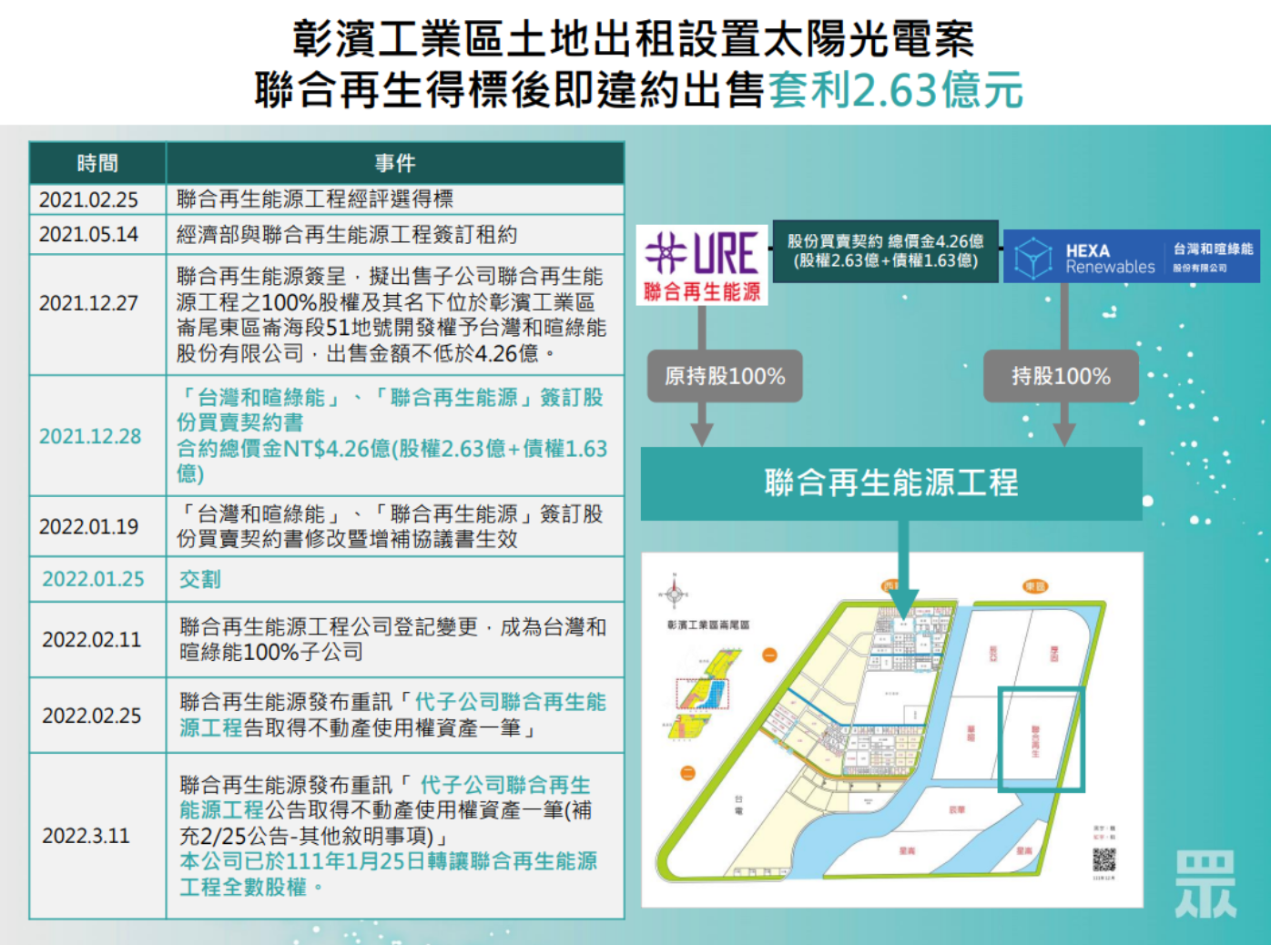 黃國昌表示,2021年2月,聯合再生打著「綠能國家隊」招牌,取得「彰濱工業區崙尾東區土地出租設置太陽光電案」51地號87公頃土地的承租權,當初評選會給出聯合再生得標的理由,除了背後的國家投資,聯合再生也同時保證使用自家光電模組 、 承諾保留生態熱區和保證絕不轉售套利,「因為拿著經濟部工業局、屬國家資源的地,主要是推動國家光電政策」。