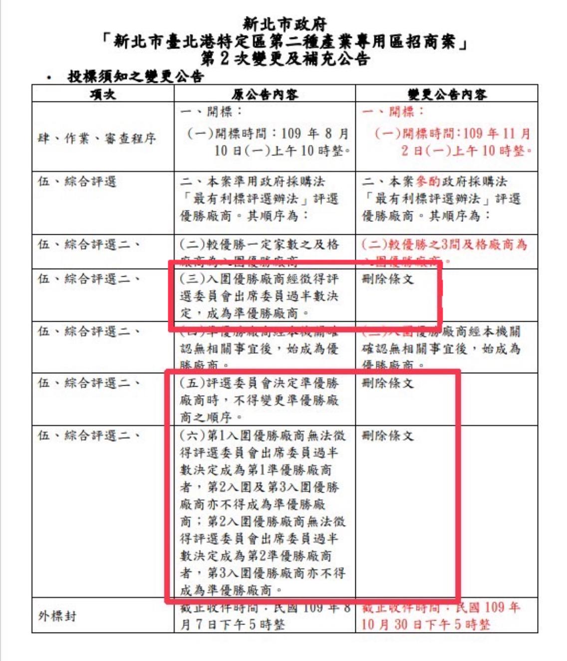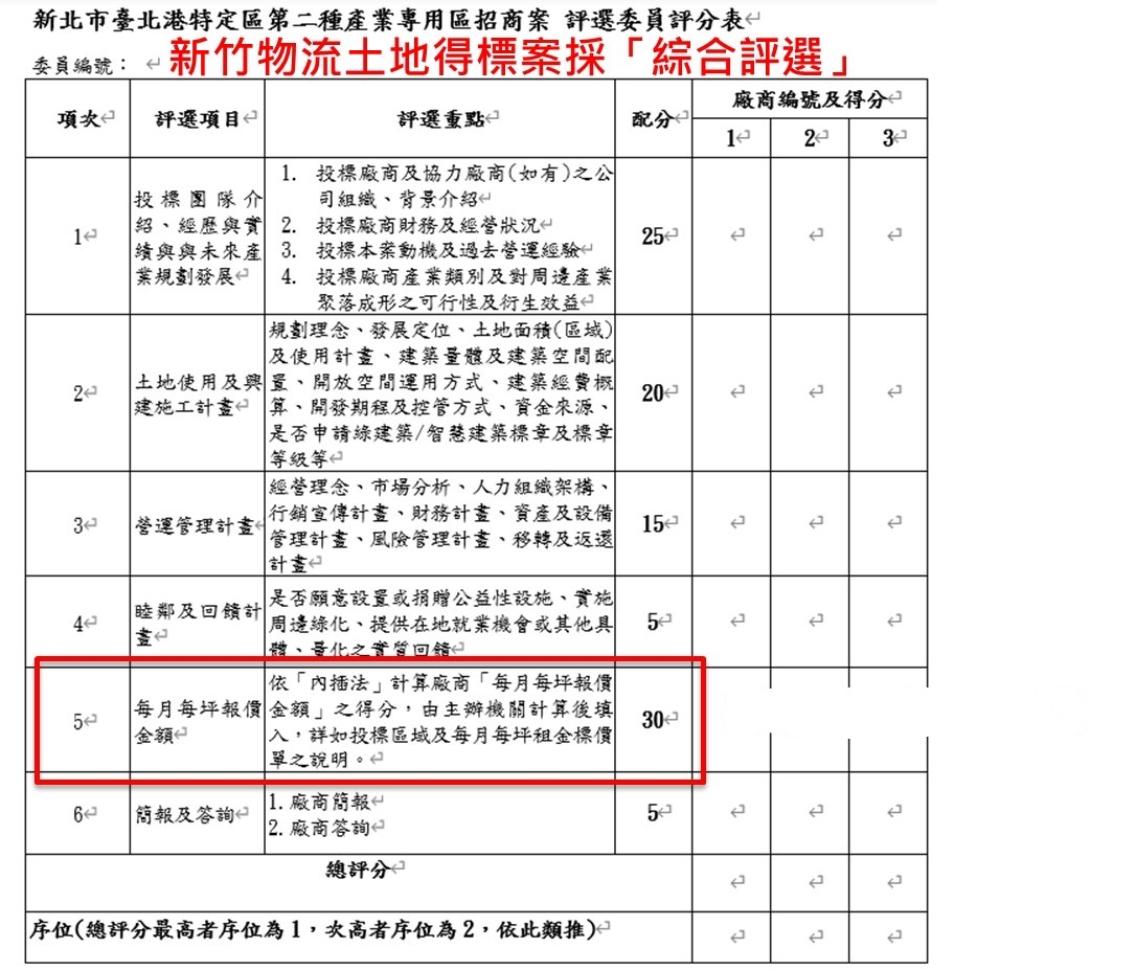 張志豪介紹,這則標案經過三次更改,第一次採取最常見的價格標,即以租金評量價高者得;第二次更改卻在有四家廠商投標的情況下改成了「綜合評選制」,其中租金只佔評比的30%;第三次則又刪減其中的三條公告內容,為新竹物流量身訂做。