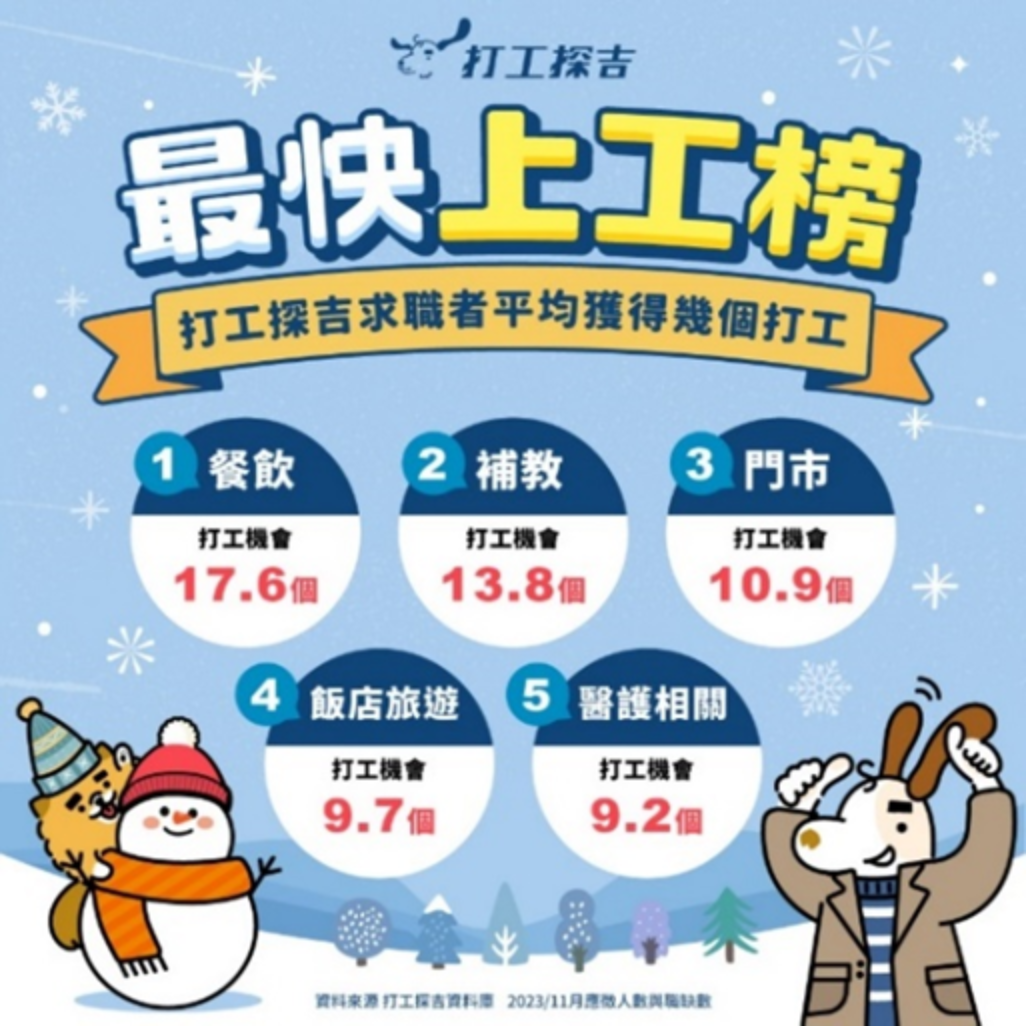 寒假打工,想快速上工怎麼做?104人力銀行顧客價值處資深協理翁維薇指出,疫後內需爆發,餐飲業、服務業大缺工,同時迎戰春節消費人潮,觀察104打工探吉,找尋餐飲工作的打工族,每人平均可獲得17.6個打工機會最多,第二名則是補教工作,每人平均有13.8個打工機會,門市工作的求職者,每人可獲得10.9個工作機會位居第三。104打工探吉也透過社群詢問大學生最常打工的類型,在回收的600多個回答中,有5成以上學生做過餐飲、補習班、門市相關工作,呼應民生消費產業好上工的程度。