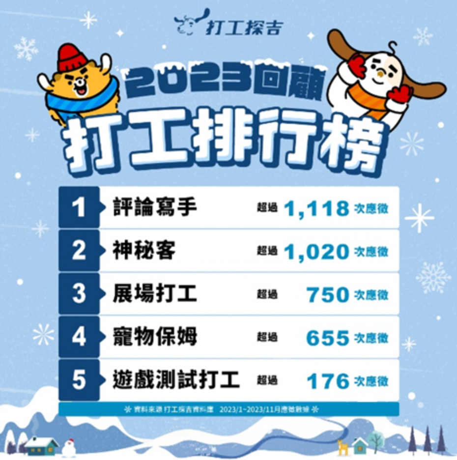 哪些打工最夯?104打工探吉公開2023年全站最夯打工排行榜,第一名是「評論寫手」超過1,118次應徵,可遠距或在家兼職,且符合年輕打工族喜歡於網路上分享特性,第二名則是「神秘客」也有1,020次應徵,工作類型屬論件計酬,且能體驗不一樣的服務,也廣受打工族青睞,第三名則是萬年不敗的「展場打工」,具短期打工又能當天領現特性。