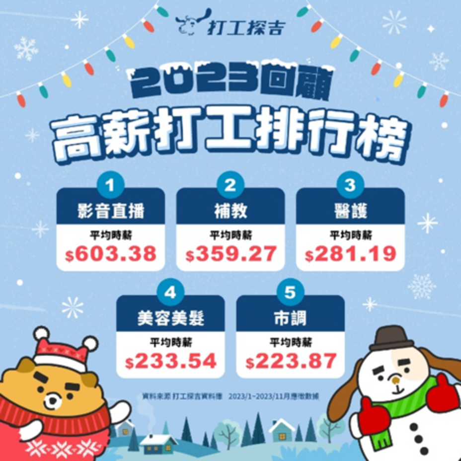 想爭取高薪,104打工探吉也公布時薪最高TOP 5職類,第一名是影音直播,時薪可達603元,疫情後宅經濟更發燒,在家上班又能爭取高薪,吸引不少打工族躍躍欲試,第二名是補教業,時薪359元;第三名是醫護,時薪281元;第四名是美容美髮,時薪233元;第五名是市調,時薪223元。