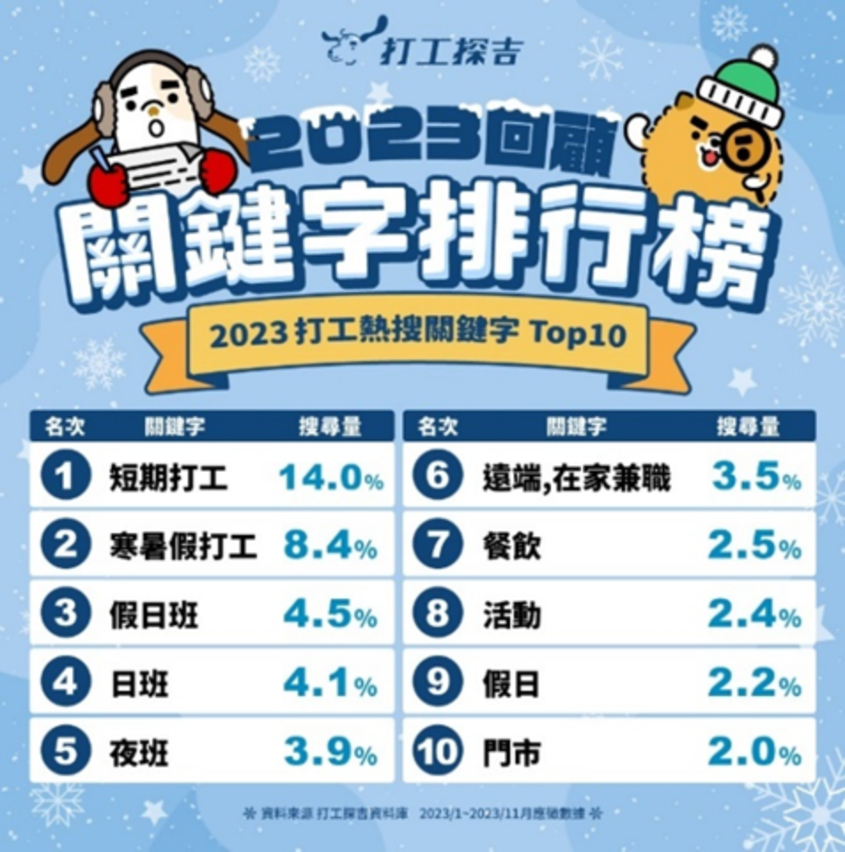 學生在挑選打工時,104打工探吉透過熱搜關鍵字發現,「短期打工」占整體14%最熱門,其次是「寒暑假打工」占8.4%、「假日班」占4.5%,時間彈性受重視。