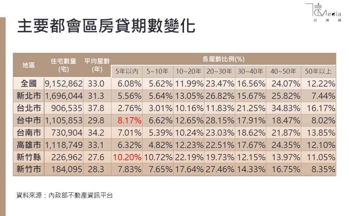 根據內政部房屋稅籍資料,全國共約有915萬戶住宅,屋齡5年內的住宅占比6.1%,約55萬宅,住宅數量最多是新北市,將近170萬戶,但5年內新屋比例不高,僅5.56%,六都中平均屋齡最年輕的是台中市,因其新屋占比8.17%,平均屋齡29.8年,是六都中唯一不到30年的區域,若比較全台各縣市,5年內新屋比例最高者為新竹縣10.20%,也是全台住宅屋齡最年輕的縣市。