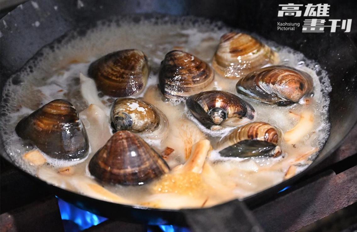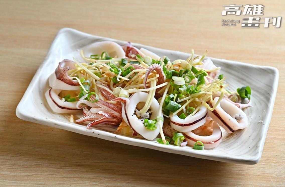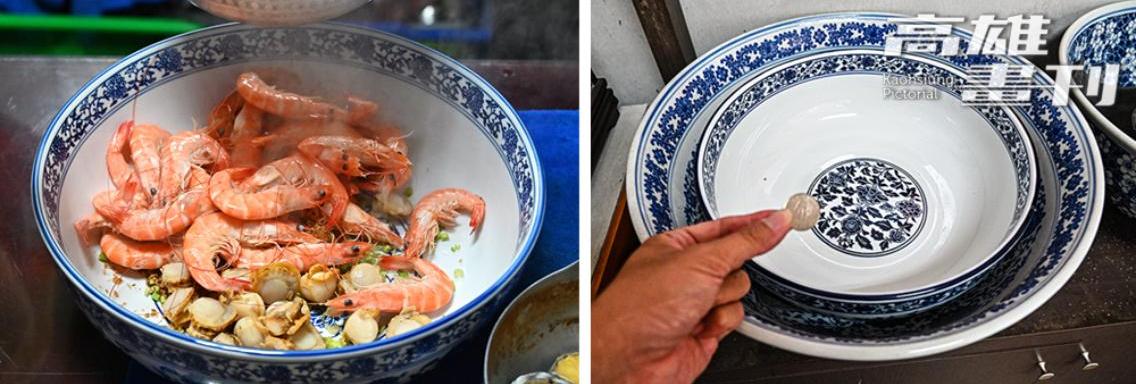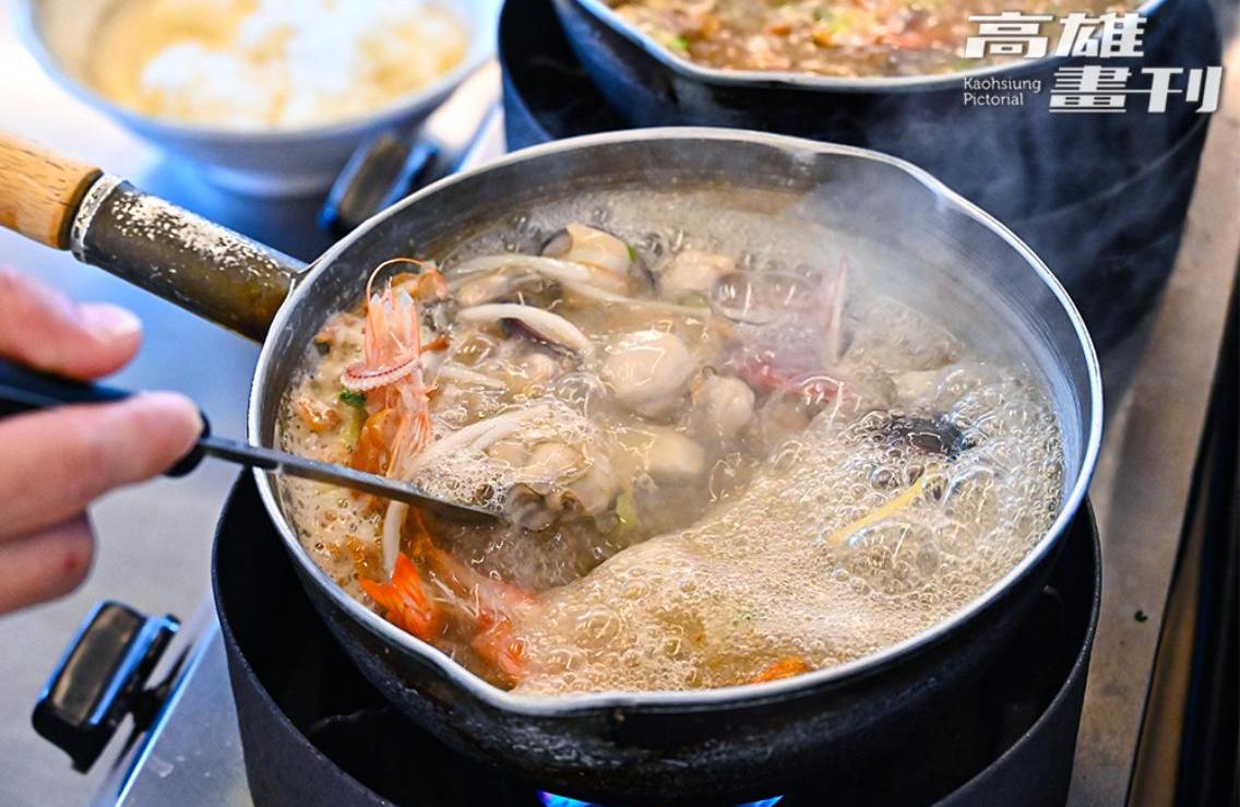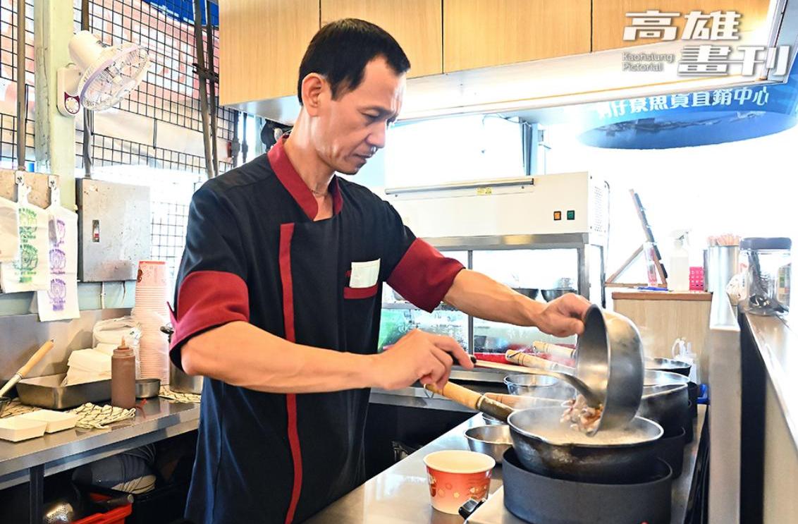北漂多年因緣際會回來高雄在梓官漁會工作,歷練中西餐飲主廚10多年,蔡昇年把一身絕活化為海鮮飯湯集大成,語帶幽默地笑稱:「在魚市場當然要賣海鮮啊!」無論是取材蚵仔寮在地的蚵仔,或嚴選3號或4號小卷,清燙鮮蚵、小卷、鹽蒸甜蝦,僅僅三樣小菜也讓人大啖得津津有味。