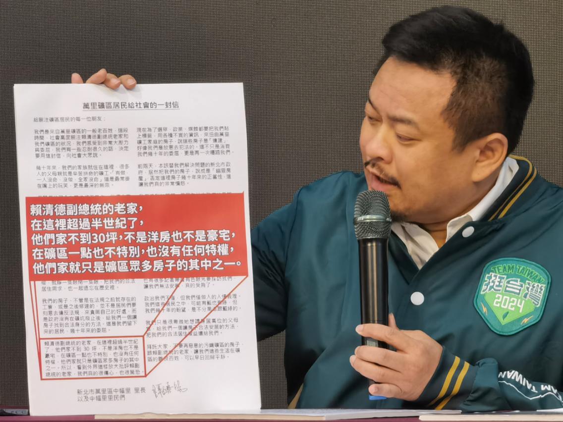洪申翰則秀出萬里礦區居民的聯合公開信,指控新北市府為礦區居民貼上「幽靈房屋」的標籤,讓居民很傷心,也感到自己被糟蹋。他還反問,如果真的認為賴清德家族是突然出現在這裡的,那賴清德真正的老家到底在什麼地方呢?