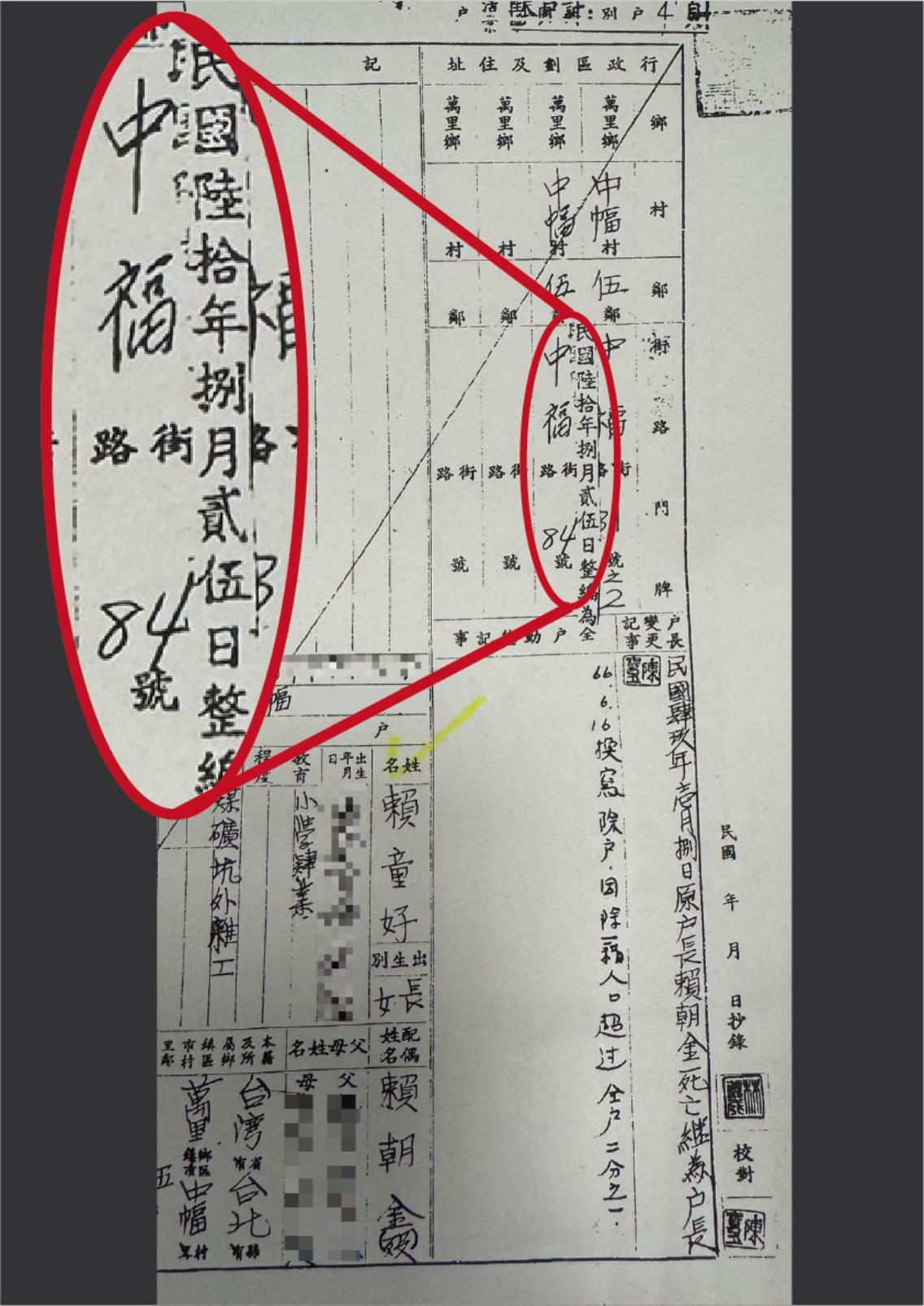 為證實萬里老屋一直存在,郭雅慧拿出地址為「中福路84號」早期仍為手寫的戶口名簿影本,強調賴家從民國47年就定居於此,賴清德在這裡出生,賴母也在這裡去世。