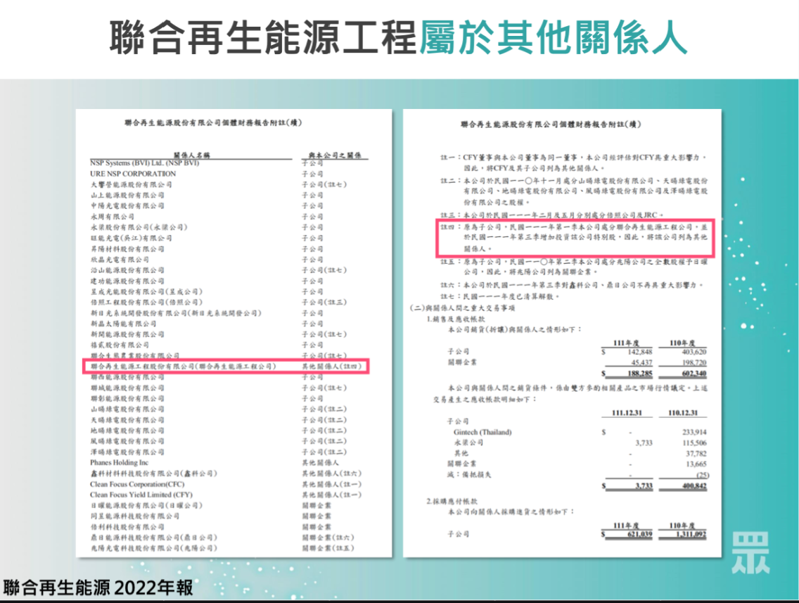 黃國昌表示,根據聯合再生2022年的年報,就已經明顯打臉經濟部說法,2022年第三季增加投資60%特別股的「聯合再生能源工程股份有限公司」,根本不是聯合再生權益法投資之子公司,僅屬於其他關係人,不具有控制力和過半表決權,充其量只是投資的金融資產。