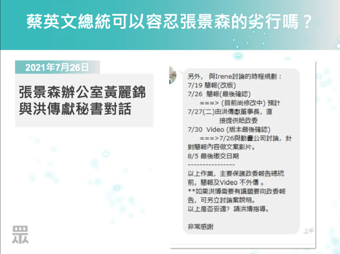 黃國昌直言如果官商勾結弊案當事人政委張景森執意說謊,便會出示更多證據進一步證實。黃國昌指出2021年7月26日張景森辦公室特助黃麗錦與聯合再生董事長洪傳獻秘書之訊息對話,清楚證實蔡英文指派的報告就是聯合再生所製作,「請問蔡總統可以容忍張景森這樣的劣行嗎?是否要追究張景森的責任?」