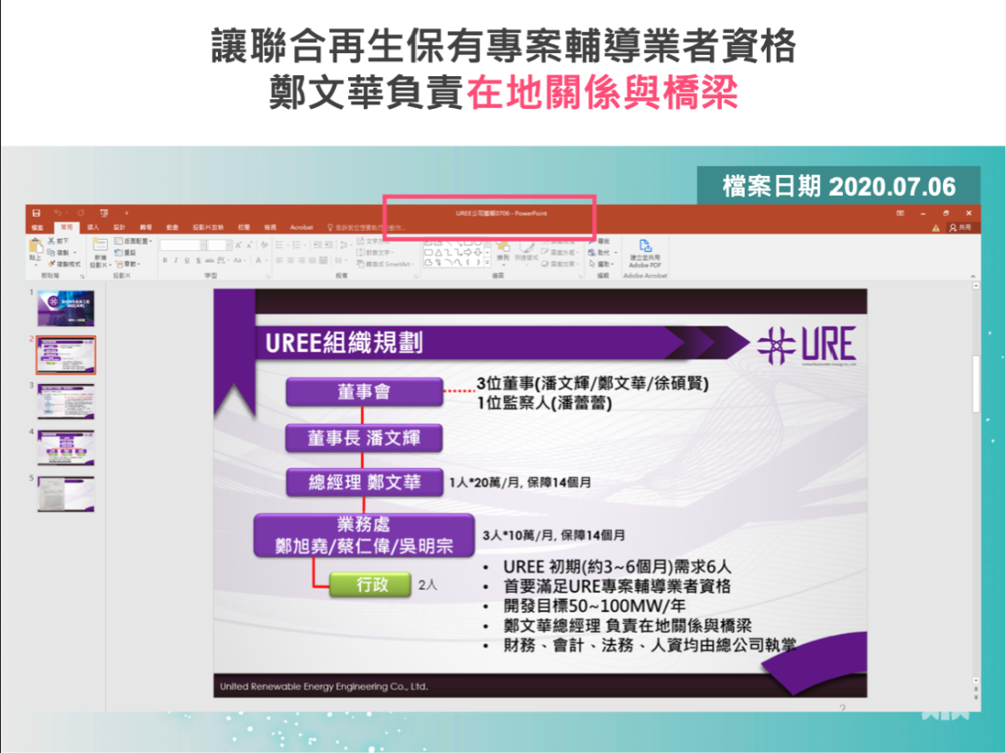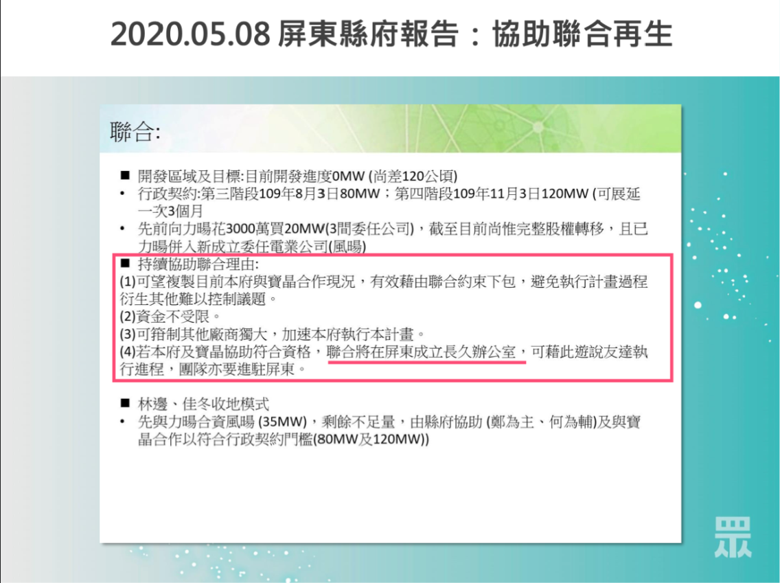 不僅如此,陳琬惠出示聯合再生的內部報告,表示早在潘孟安的前民政處長鄭文華退休前兩個月,聯合再生就已經準備好設立屏東辦公室,為保有專案輔導業者資格,由鄭文華負責在地關係與橋樑,甚至連屏東辦公室的設置地址都是鄭文華所建議。