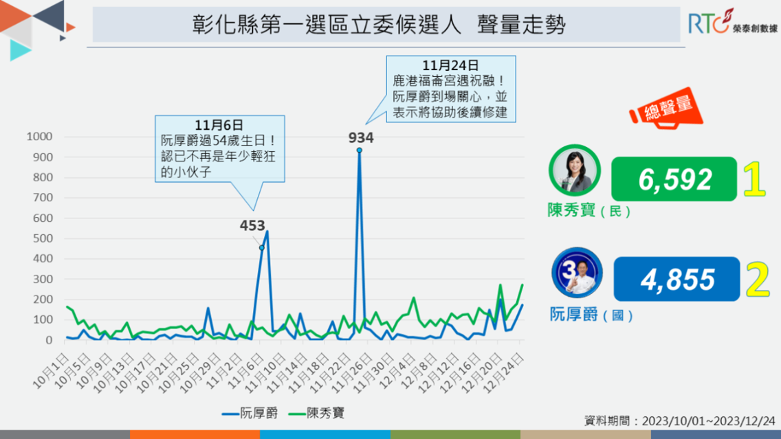 《榮泰創數據》分析10月以來兩位立委候選人的網路聲量,陳秀寳聲量表現平穩且來源較阮厚爵多元,除了自己粉絲專頁占最大宗外,包括同派系的內政部長林右昌、立委陳亭妃和黃秀芳等人都透過自媒體創造聲量,讓陳秀寳的網路聲量達到6、5千則。