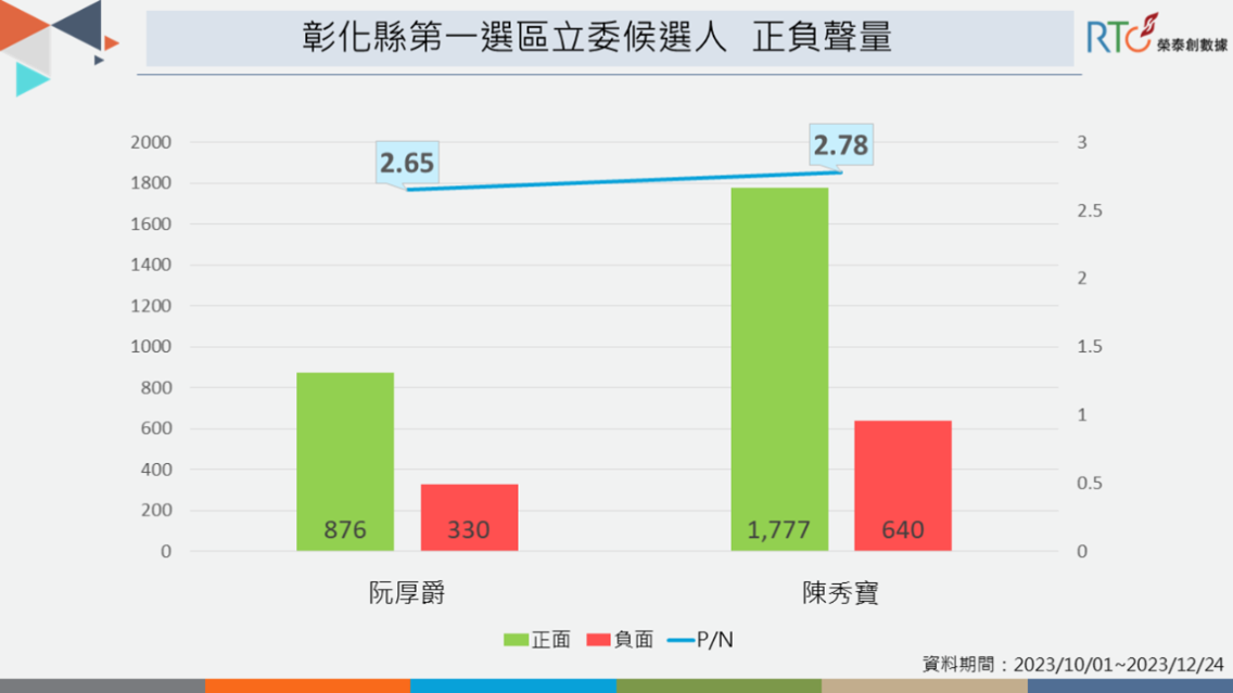 陳秀寳不僅網路聲量較高,其網路好感度也以2.78領先阮厚爵的2.65,在空戰上可說是壓縮對手的選舉空間。