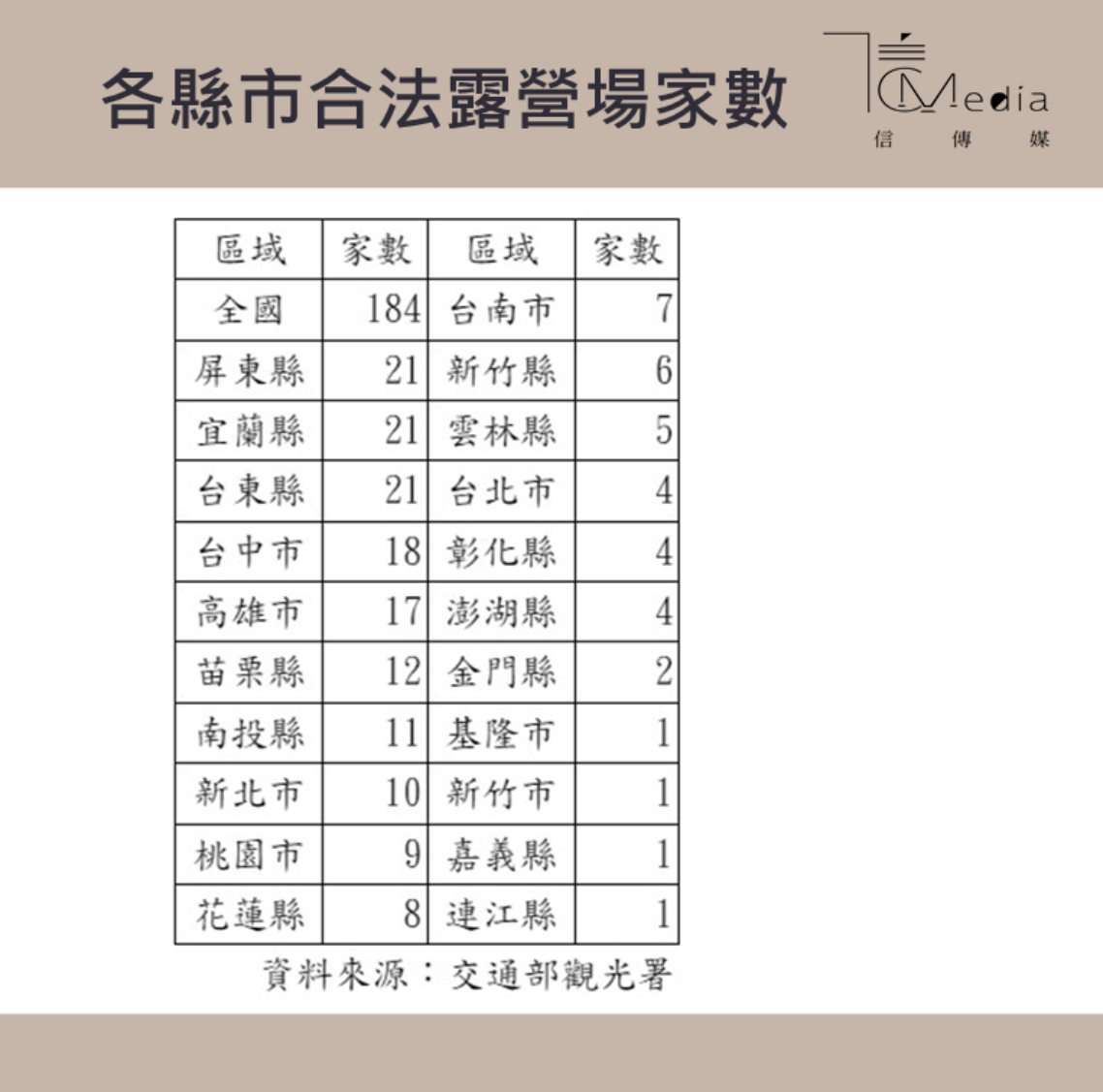 近幾年露營風潮興起,位於風景區或具有天然景觀的土地,成為露營熱門景點,根據交通部觀光署資料,全國合法的露營場共有184家,家數最多的縣市有屏東縣、宜蘭縣及台東縣,這3個縣市都各有21家露營場。