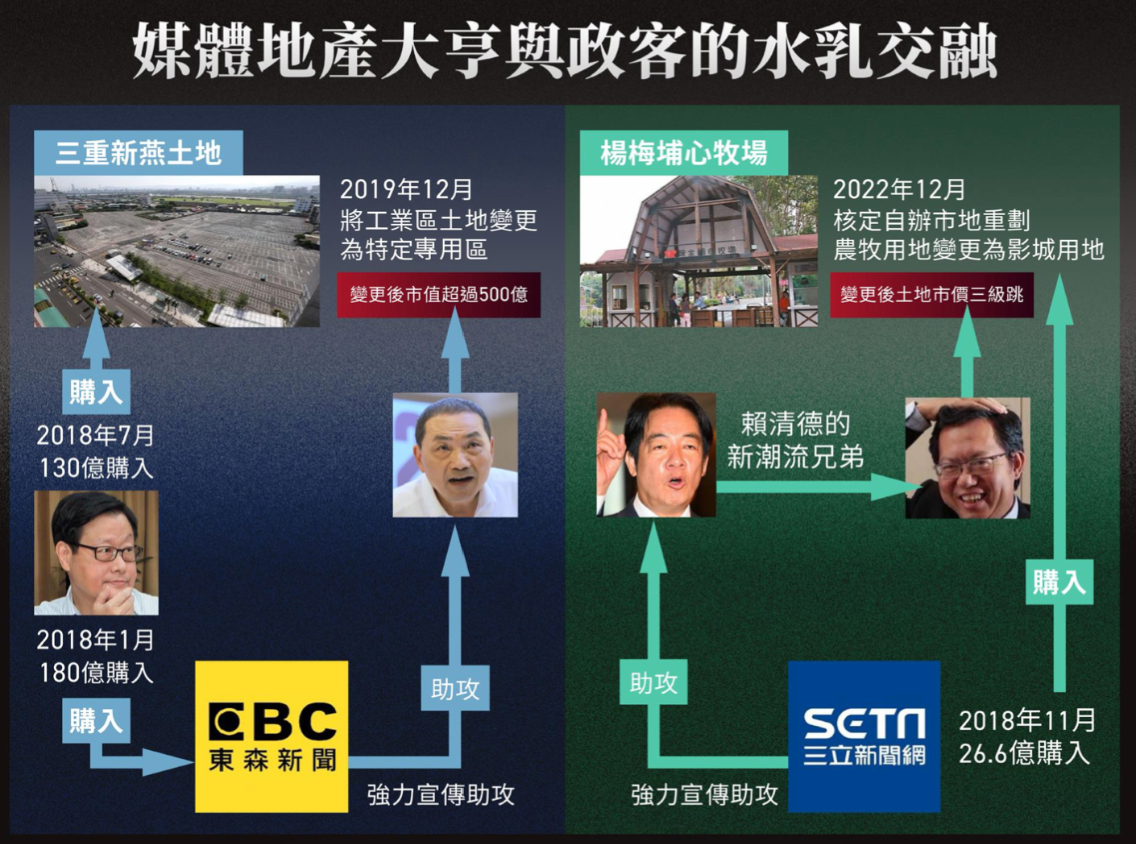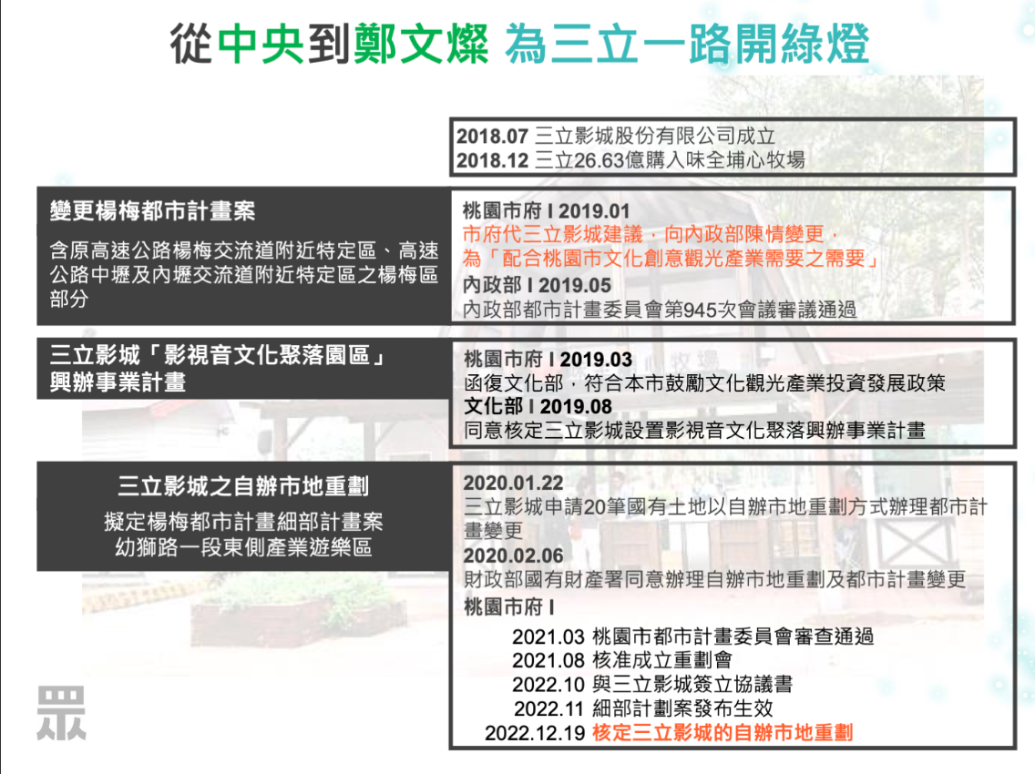 黃國昌表示三立集團的關係企業蘇麗投資(後更名為永興資本)成立「三立影城股份有限公司」,2018年12月以26.63億購入桃園楊梅的「味全埔心牧場」,目的是要將埔心牧場之農牧用地變更為影視專區。黃國昌指出,在購入土地後,從鄭文燦主導的桃園市政府到中央機關,土地變更過程非常順利,「更在鄭文燦卸任前匆匆忙忙核定通過三立影城在該地的自辦市地重劃,讓三立集團獲取龐大利益」。