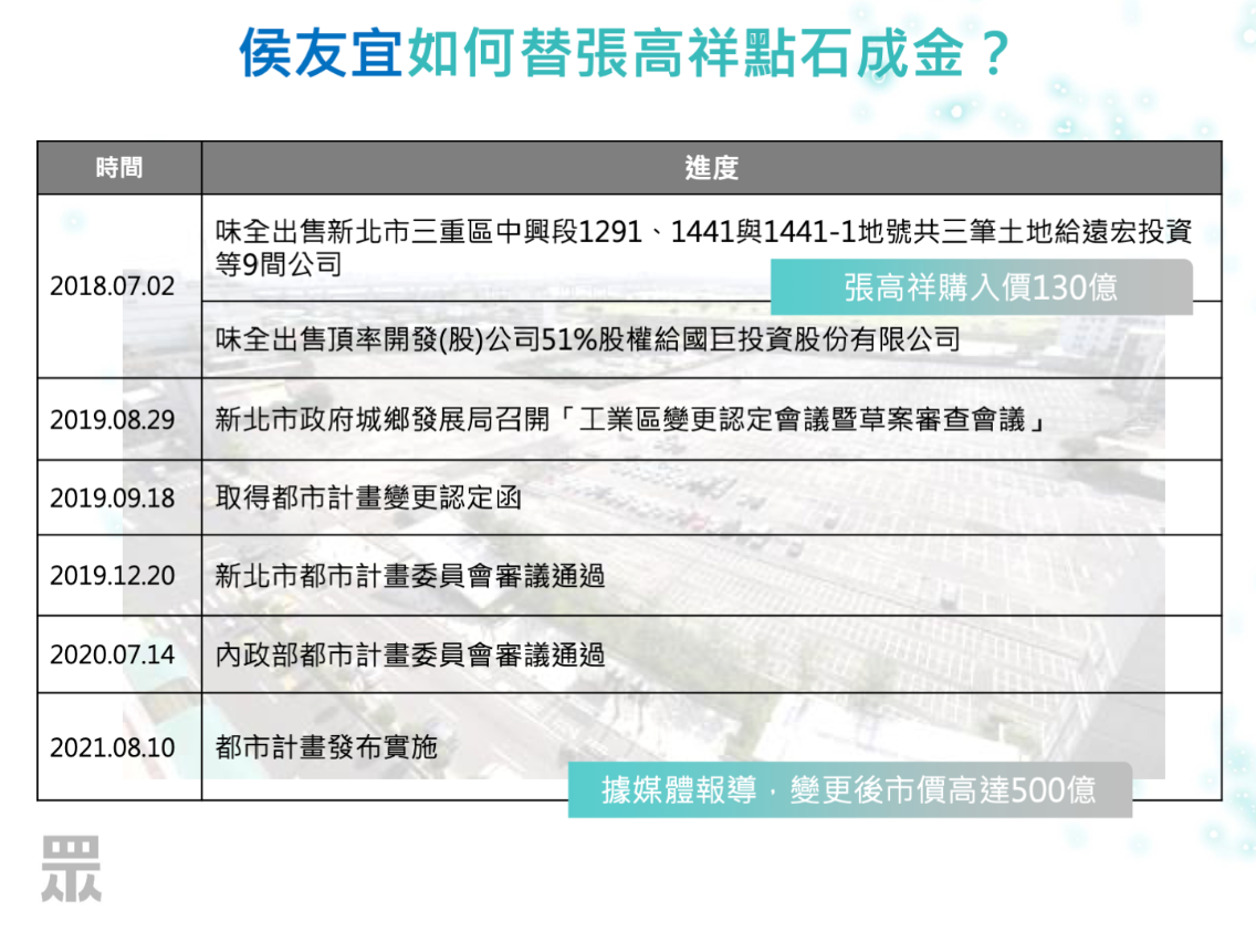 陳智菡接著提到茂德集團暨東森集團總裁張高祥,2018年7月以130億購入過去20年無法變更的味全三重廠土地,短短兩年內,讓乙種工業區土地變更為特定專用區,根據媒體報導,地目變更後土地市價高達500億,「全案可以說是清水變雞湯,整個市值三級跳,從130億暴增到500億」。