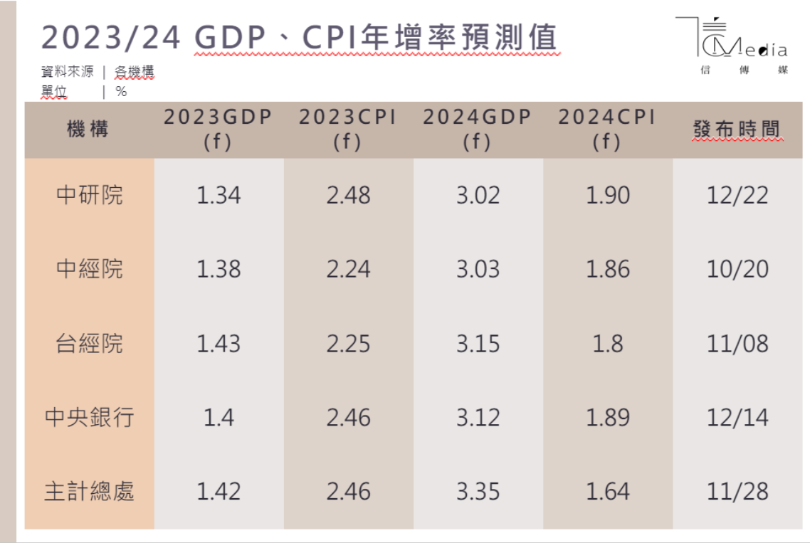 隨著2024即將到來,國內各大主要機構也陸續發布對於明年台灣經濟成長預測及看法,雖細節略有不同,但普遍以台灣明年下半年將顯著成長為主要基調。