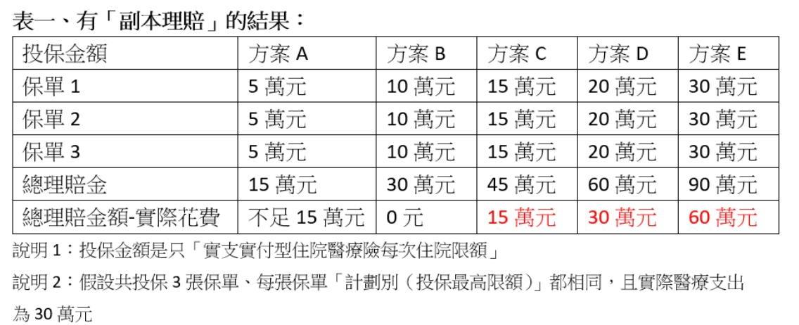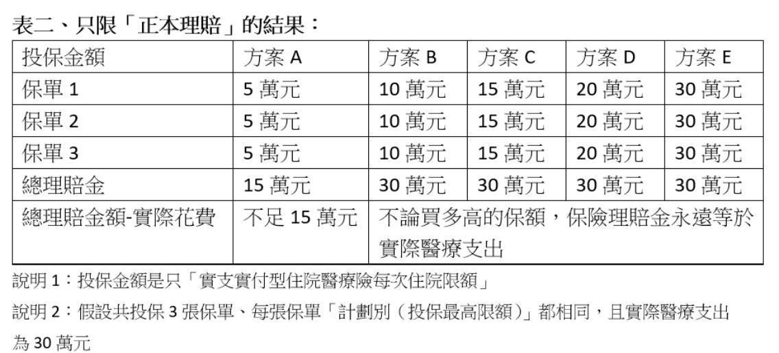 以上表一為例,方案一的保戶,由於沒有「足額投保」。所以有15萬元的醫療開銷,要自行「買單」。至於方案C、D、E,保戶實際支出只有30萬元,卻可以分別從3張保單中,總共「賺到」各15、30及60萬元。這也是最為垢病的「用保險賺錢(違反保險「損害填補原則」)」的關鍵。