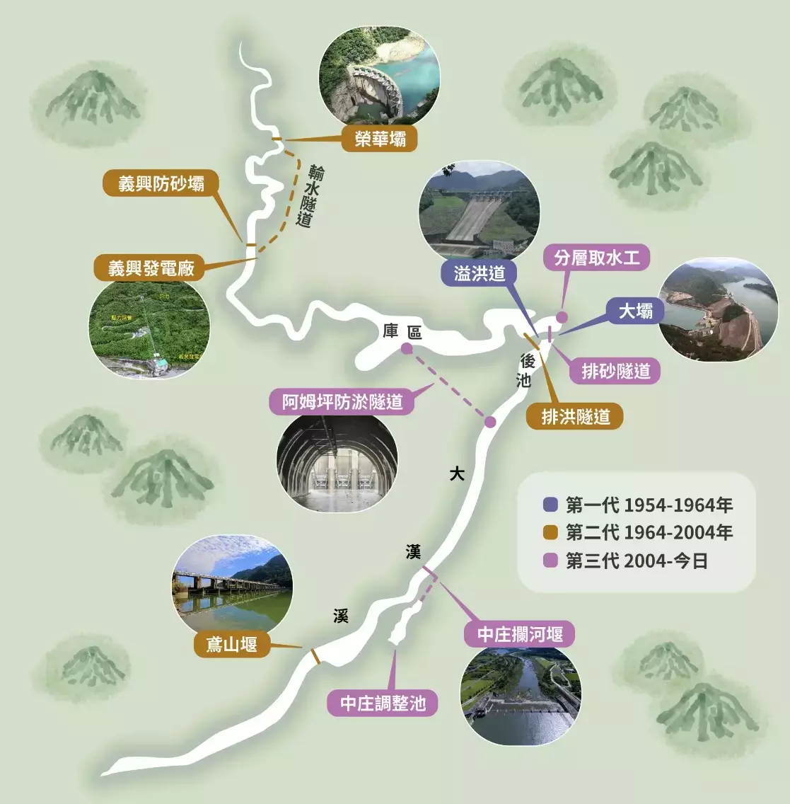 說到臺灣北部的重要水庫,就不能不提「石門水庫」。這座橫跨桃園市大溪區、龍潭區、復興區與新竹縣關西鎮的水庫,是臺灣第一座多目標水庫,具備公共給水、灌溉、防洪、發電、觀光等功能。每到颱風季,觀看洪水從石門水庫溢洪道奔騰而出,是許多臺灣民眾共同的記憶;枯水期時,水庫的蓄水率也是近年民眾相當熟悉的新聞畫面。