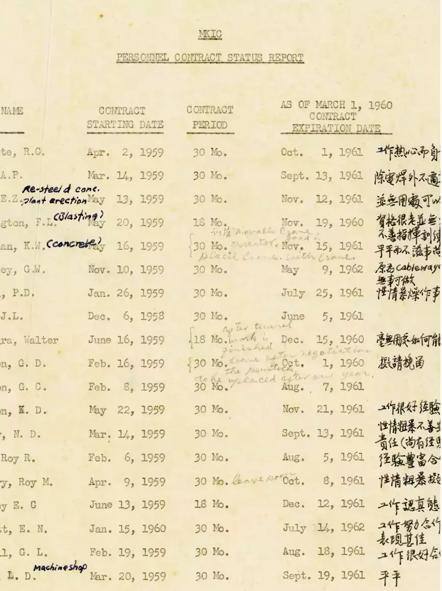 在石建會檔案中,有一份美國莫克公司人員合約狀態報告表,上頭由臺灣高階工程師為美國工程師的工作表現寫上評語,方便石建會進行人事評估。只見泛黃紙張上的藍色墨水筆跡寫到:Bassette 工作熱心而負責、Bonnington 不善指揮訓練、Kingery 性情粗暴擬同意遣返等犀利評論。