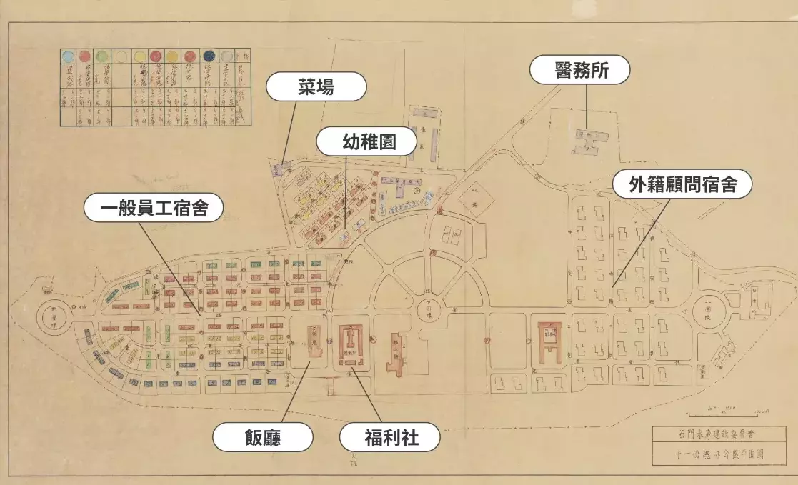 其中,外籍顧問宿舍特別仿效美國獨門獨院社區型式,備有泳池、運動場、高爾夫球果嶺等設施。另設有飯廳、醫務所、幼稚園、福利社等公有設施,滿足全體員工及眷屬的基本生活需求。